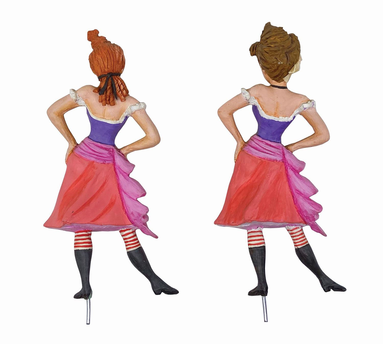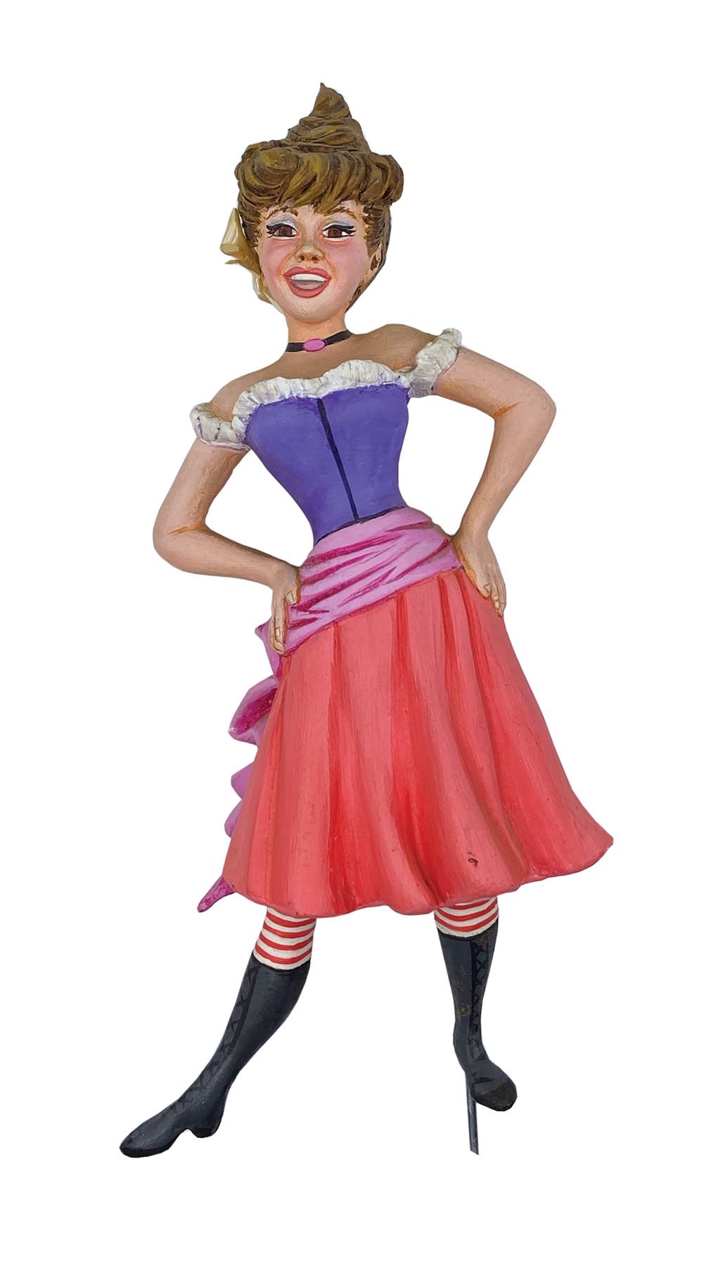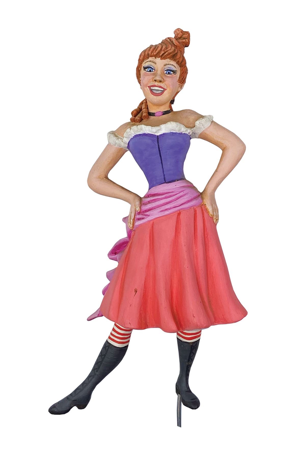 (Walt Disney World, c.1970s) A pair of character concept models from the unrealized Western River Expedition attraction at Walt Disney World. The showgirls appear in the raucous vignette in Dry Gulch, dancing outside the Golden Slipper Saloon. Designed by legendary Imagineer Marc Davis, these original figures were created for the attraction model built by WDI. Constructed hand-sculpted clay over cast components with a metal armature that protrudes from the feet, the wonderfully expressive character concept models are expertly hand-painted and finished in minute detail. At 1.5”:1’ scale, the Western River Expedition model was the largest that Disney had created up to that point, with costs running into the hundreds of thousands of dollars. Called the greatest attraction that never was, the Western River Expedition was to be Marc Davis’s chance to improve upon and surpass his wildly successful Pirates of the Caribbean in both size and imagination. Given that Florida is located so close to the actual Caribbean, it was thought that Pirates of the Caribbean wouldn’t hold the same romantic pull that it did to people more geographically distant. Enter the Western River Expedition, bringing the size and grandeur of the Wild West to tourists in the East. It was to be the signature attraction within the planned Thunder Mesa complex, which was to house multiple rides including a log flume and a runaway mining train rollercoaster. While elements of the River Expedition were eventually repurposed for other attractions, these excessively rare character concept models are the best representation of Marc Davis’s original vision to survive. Each measuring 10” tall, the figures are in generally very good condition. Bear in mind that these are hand-made concept models used for scenic design and blocking purposes in a working model of the attraction. They may exhibit a stray drip of paint from an element being worked on around them or a chip or crack from hurried rearrangement in a surge of inspiration. Both exhibit some wear and handling.