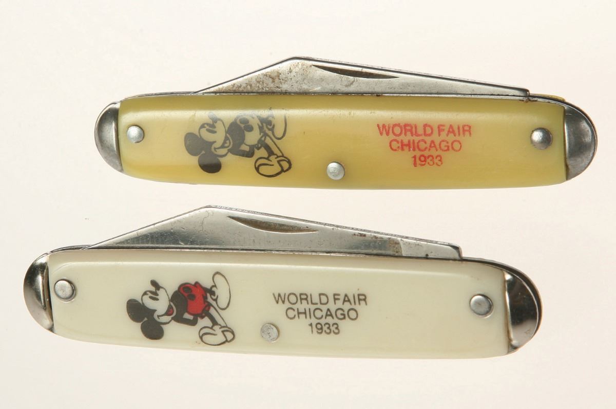 (1970s) Set of (2) "World Fair" Chicago 1933 White and Yellow Pocket Knives. Often mistaken for actually being from the 1933 World's Fair, these pocket knives began showing up on the market in the 1970s. The Mickey is a more modern version of what would have been featured at the time, and perhaps most telling, is that the inscription says "World Fair" rather than "World's Fair". Still a wonderful artifact and a popular collector's item. Measure 3.5" long and come in white and yellow variants.