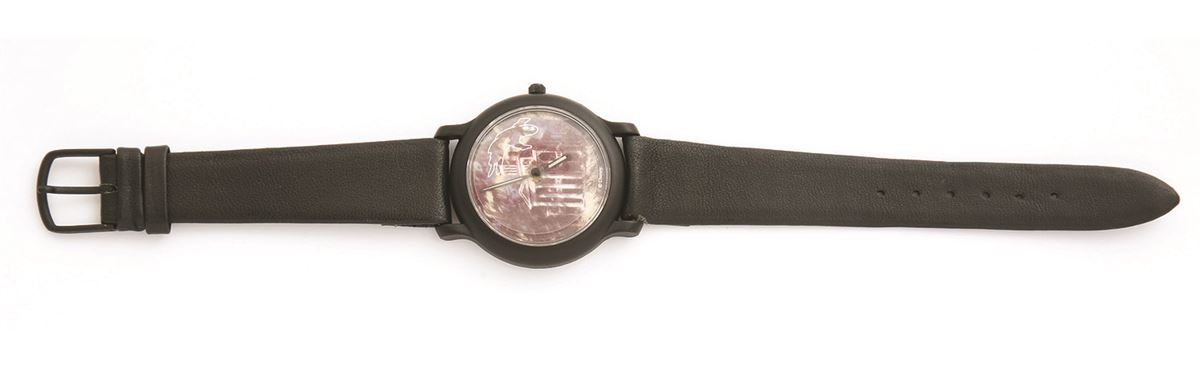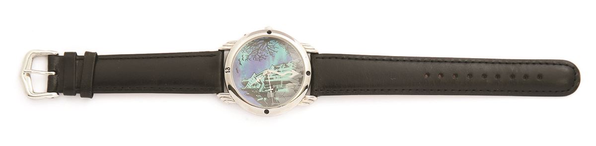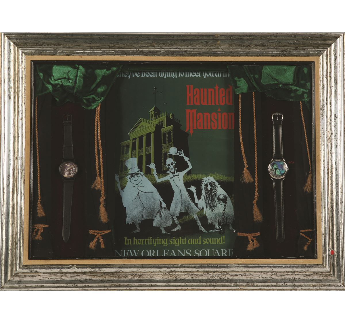 (Disneyland 1990s) Pair of early “company D” cast-member exclusive watches, including the rare Haunted Mansion watch, within a custom shadow frame. Measures 18.5"x24" in frame. In very good condition.