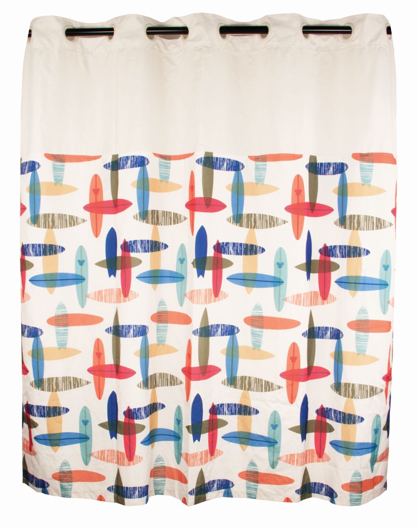 (California Adventure, c.2010) An original unused shower curtain and liner from California Adventure's Paradise Pier Hotel featuring a colorful surfboard pattern with hidden Mickeys. Made of 100% polyester, this item measures approximately 66"x72" and is in good unused condition with some signs of wear particularly around the rings, one of which has separated from the fabric.