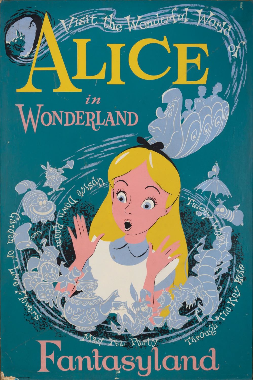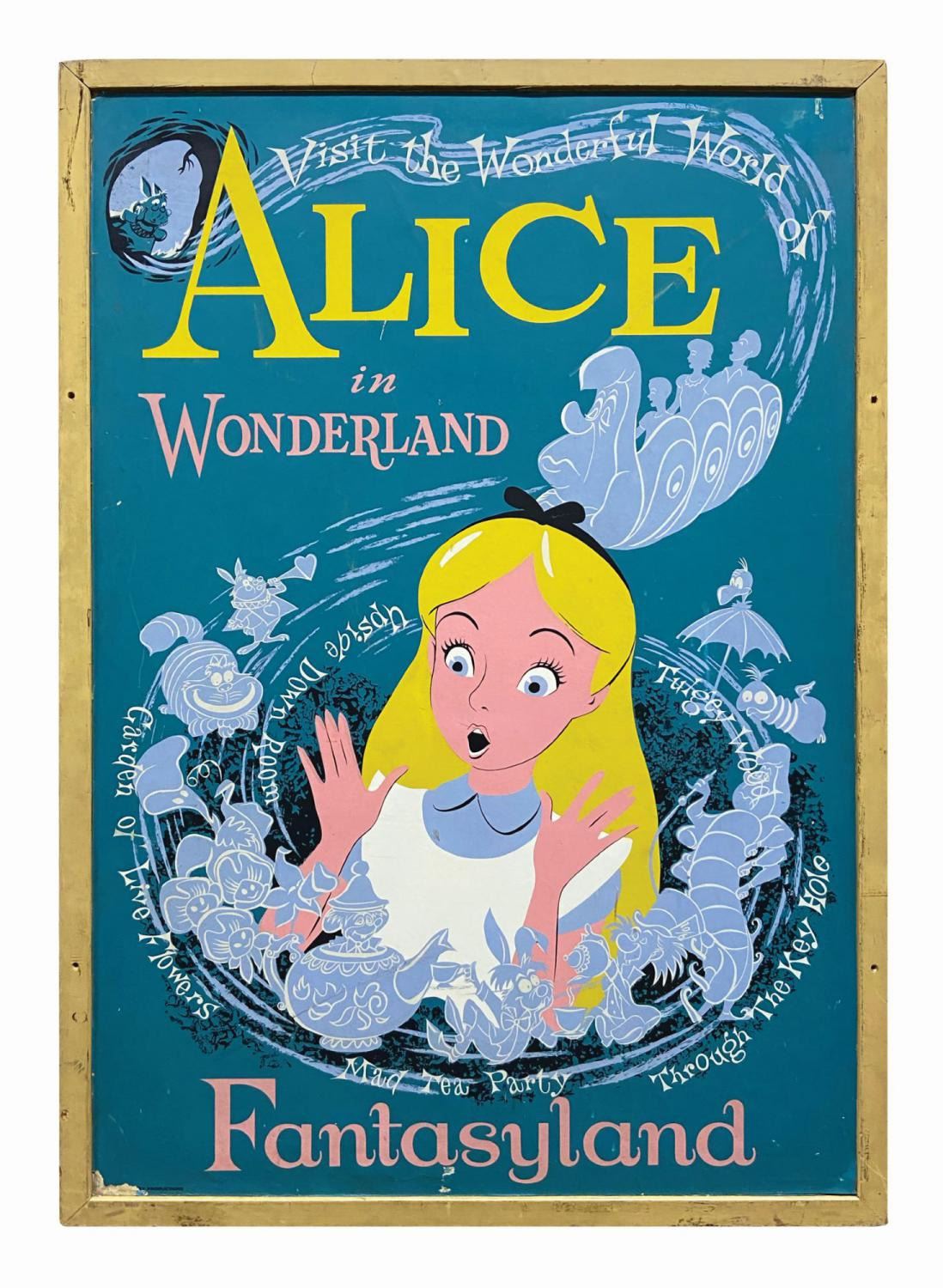 (Disneyland, 1958) One of the rarest Disneyland attraction posters, this is an original park-used hand-silkscreened poster for Disneyland's Alice in Wonderland attraction with "Fantasyland" proudly displayed along the bottom edge. Designed by Imagineer Sam McKim, the poster features the popular image of Alice down the rabbit hole with the denizens of Wonderland. This is the only such example of this rare "Fantasyland" Alice in Wonderland poster that we have ever seen offered for public sale. Most attraction posters that still survive today were never actually installed for use within Disneyland, however this particular poster was mounted within its frame and used within the park. The poster measures 53.5"x35.5" and the frame is 56.5"x38.5". Both are in good condition. The poster exhibits corner and edge chipping, areas of spot paper loss at the top, bottom, and sides, minor tears, scratches, and scuffs throughout from outdoor display. The back of the board is cracked. Interestingly, to help reduce the amount of silkscreening needed on these posters, some of the white in Alice's face was actually just the color of the poster paper showing through, instead of a silkscreen layer. As such, this park-used poster, which was adhered in its park-used frame for several decades, had someone browned in those white paper areas. Some color restoration of the white in Alice's face has been professionally done, which creates a gorgeous display. This item may require special shipping arrangements, please inquire for details and estimates.