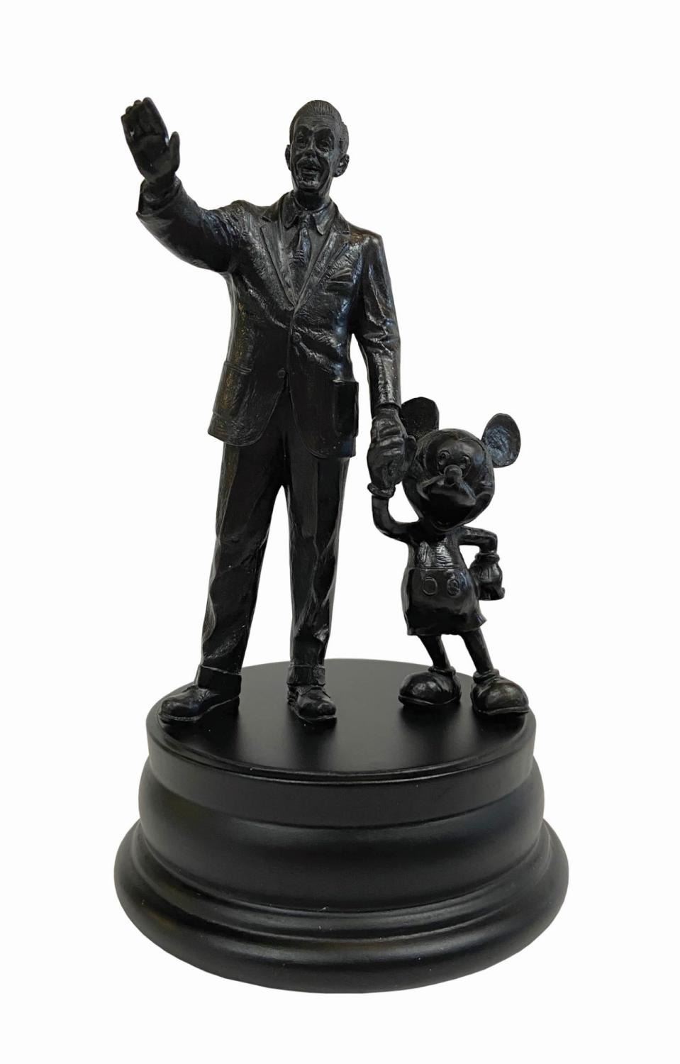 (Disneyland, c.2005) A miniature replica of artist Blaine Wilson's sculpture titled Partners, released by the Art of the Disney Theme Parks Collection. The iconic statue features family entertainment pioneer Walt Disney with his most famous creation, Mickey Mouse, and the original is installed in a permanent home in front of Sleeping Beauty Castle at Disneyland.  Constructed of bronze with a wooden pedestal base, the felted bottom is stamped in silver ink with collection information. The statue measures 9"x5" and 5.5" deep and is in fine condition with only minor wear to the bottom of the base. The original 6.5"x10" and 6.75" deep black Disney box is included and exhibits minor creasing.