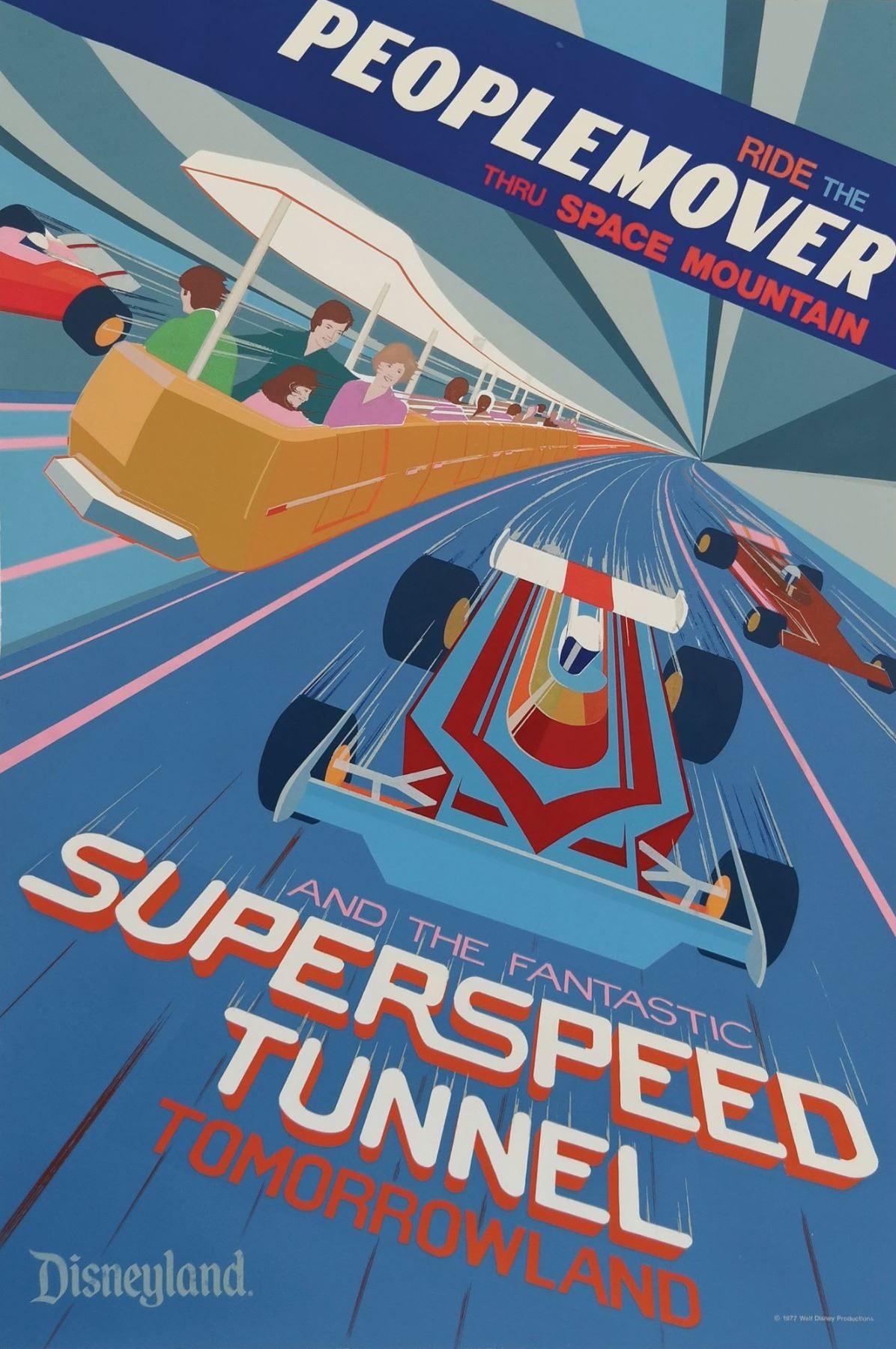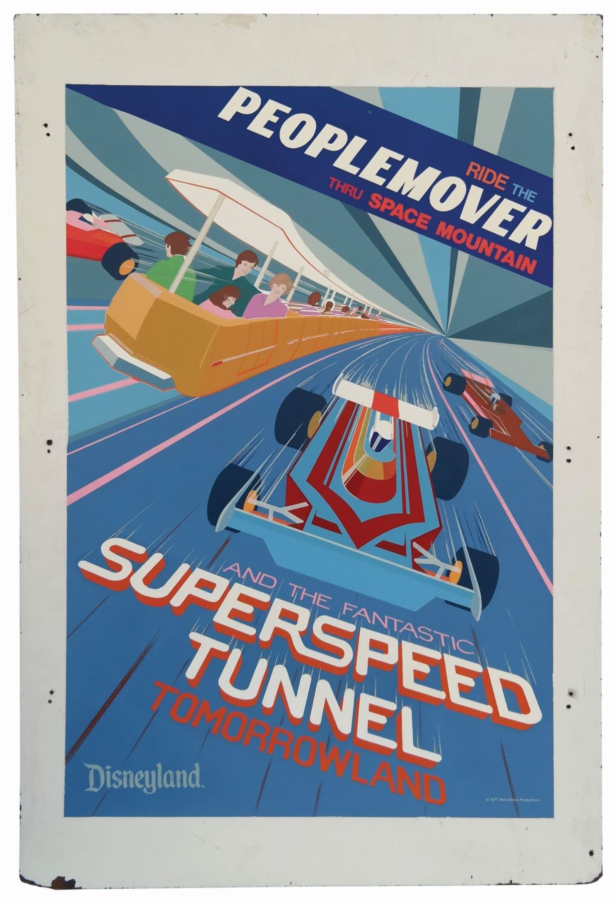 (Disneyland, 1977) An extremely rare park-used attraction poster for the PeopleMover at Disneyland. Designed by Tim Delaney, this hand-silkscreened poster promoted the SuperSpeed Tunnel expansion to the attraction, which was located in the upper level of the Carousel Building in Tomorrowland. The SuperSpeed Tunnel featured projected imagery of race cars on the walls, and after only 5 years, was re-themed again to promote the feature film Tron. This incredibly scarce poster was mounted to masonite board for display within Disneyland, and has an image size of 45"x30" on the 53.5"x36" board. The poster is in very good condition overall, with some small chips and wear to the edges of the masonite, and minor surface wear to the poster from use. The poster has had some professional restoration to areas of the paint. This is the only surviving example of this poster we have ever seen offered for public sale.