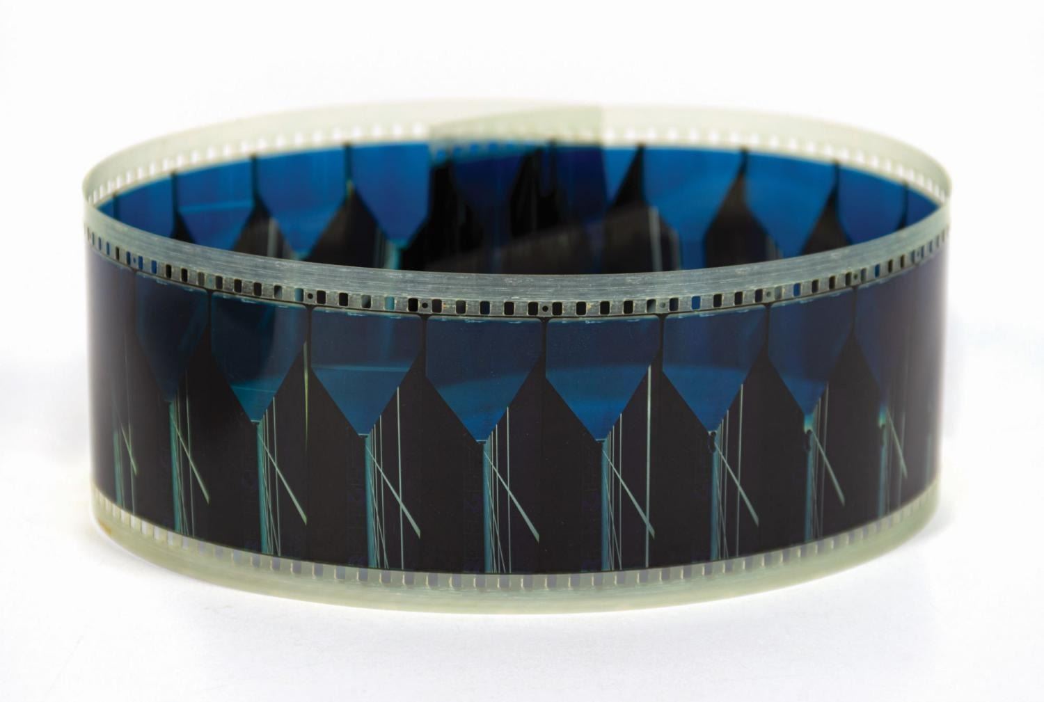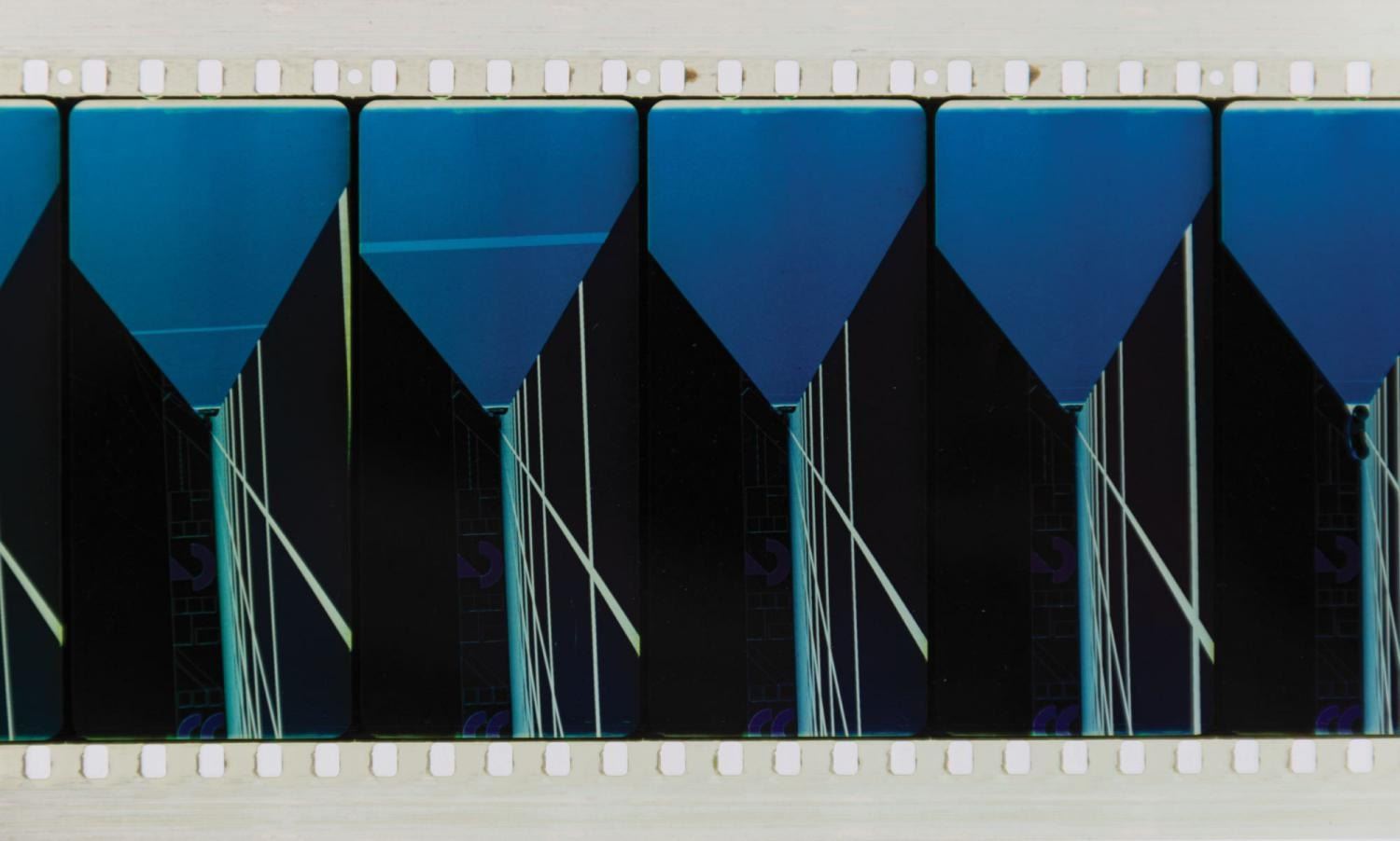 (Disneyland, c.1982) A rare strip of 70mm film from the PeopleMover Thru the World of Tron attraction in Disneyland's Tomorrowland. This 24-frame strip played in the SuperSpeed Tunnel portion of the attraction, which gave passengers the illusion that they were actually inside the Tron game, and depicts a light cycle charging across the grid. The strip was trimmed from a larger reel at top and bottom, leaving partial frames at the top and bottom. Measuring 23.25"x2.75", the film is in very good park condition with minor surface wear.