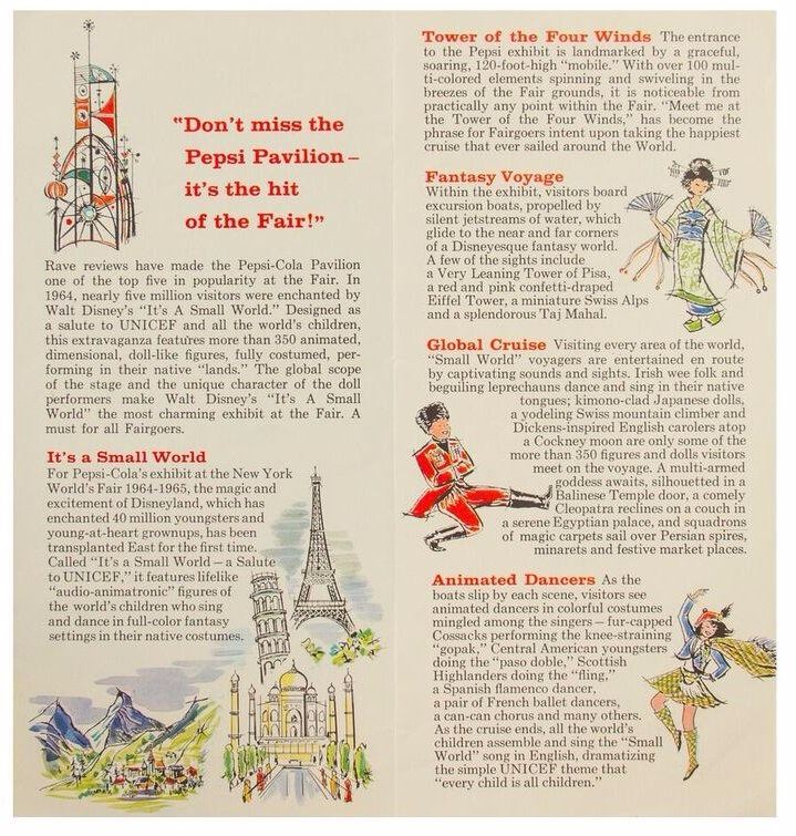 (World's Fair, 1964) An early brochure for the "It's a Small World" attraction at the 1964-65 New York World's Fair. The brochure includes information on the different aspects of the attraction as well as the "Tower of the Four Winds". This item measures 8.5"x4" and is in very good condition.