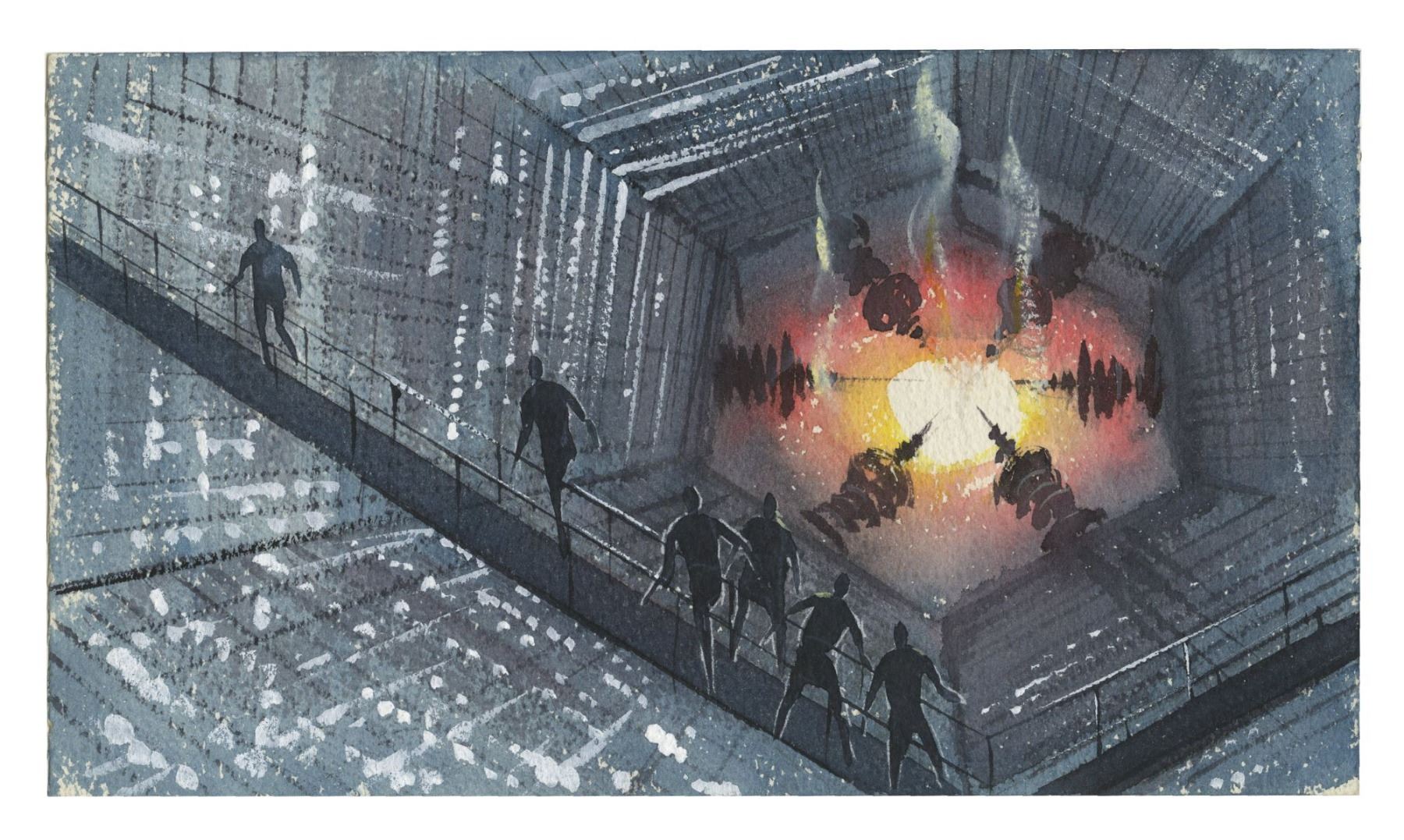 (Disney, 1979) An original concept painting created for the Walt Disney feature film "The Black Hole". Although the artwork is not signed, the style, medium, and color choices used in this concept help us attribute this painting to artist Peter Ellenshaw. Accomplished in acrylic on slightly textured artist's paper, the painting measures approximately 5"x9". The condition is very good with minor wear from production use.