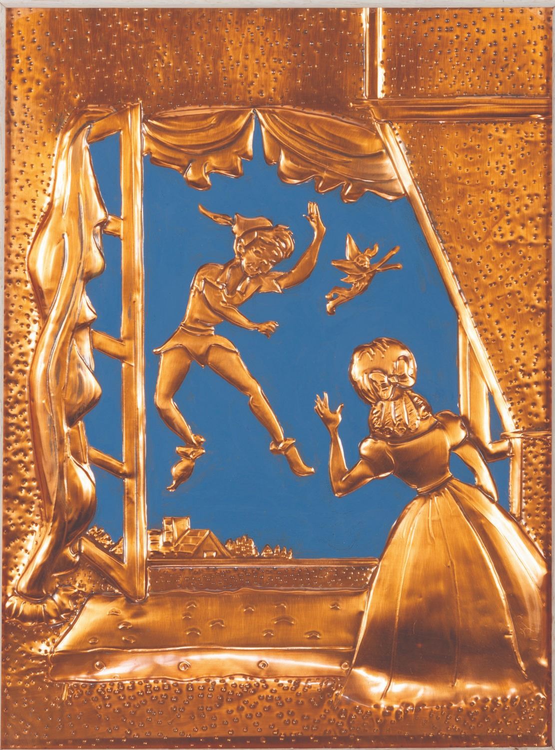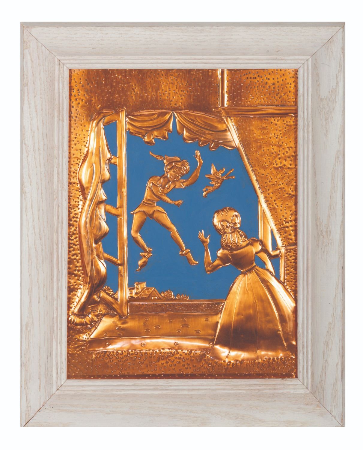 (1950s-60s) A hand-punched copper wall piece featuring Tinker Bell, Peter Pan, and Wendy Darling created using a craft kit. Measuring 8.5" x 11.5" in a 12" x 15" wooden frame, the piece is in fine condition.