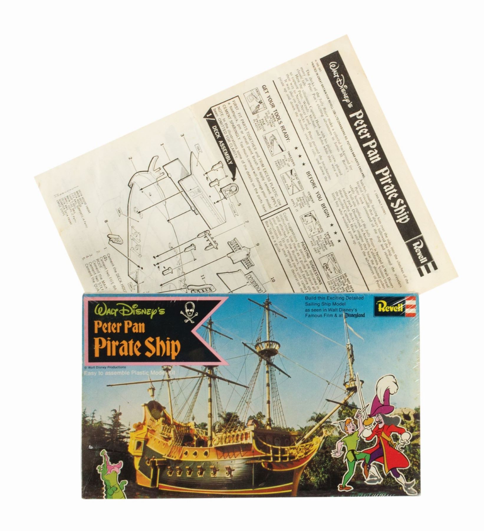 (Disneyland, 1969) A very rare model kit of the pirate ship from Walt Disney's animated feature film, "Peter Pan". The box lid reads "Build the detailed sailing ship model as seen in Walt Disney's famous film & at Disneyland". This item comes in its original box and is still sealed in plastic wrap. The box measures 6.25"x10" and 1.25" thick and is in very good condition with minor wear and some spots of discoloration to the box lid from age. The kit includes an additional separate copy of the instructions.
