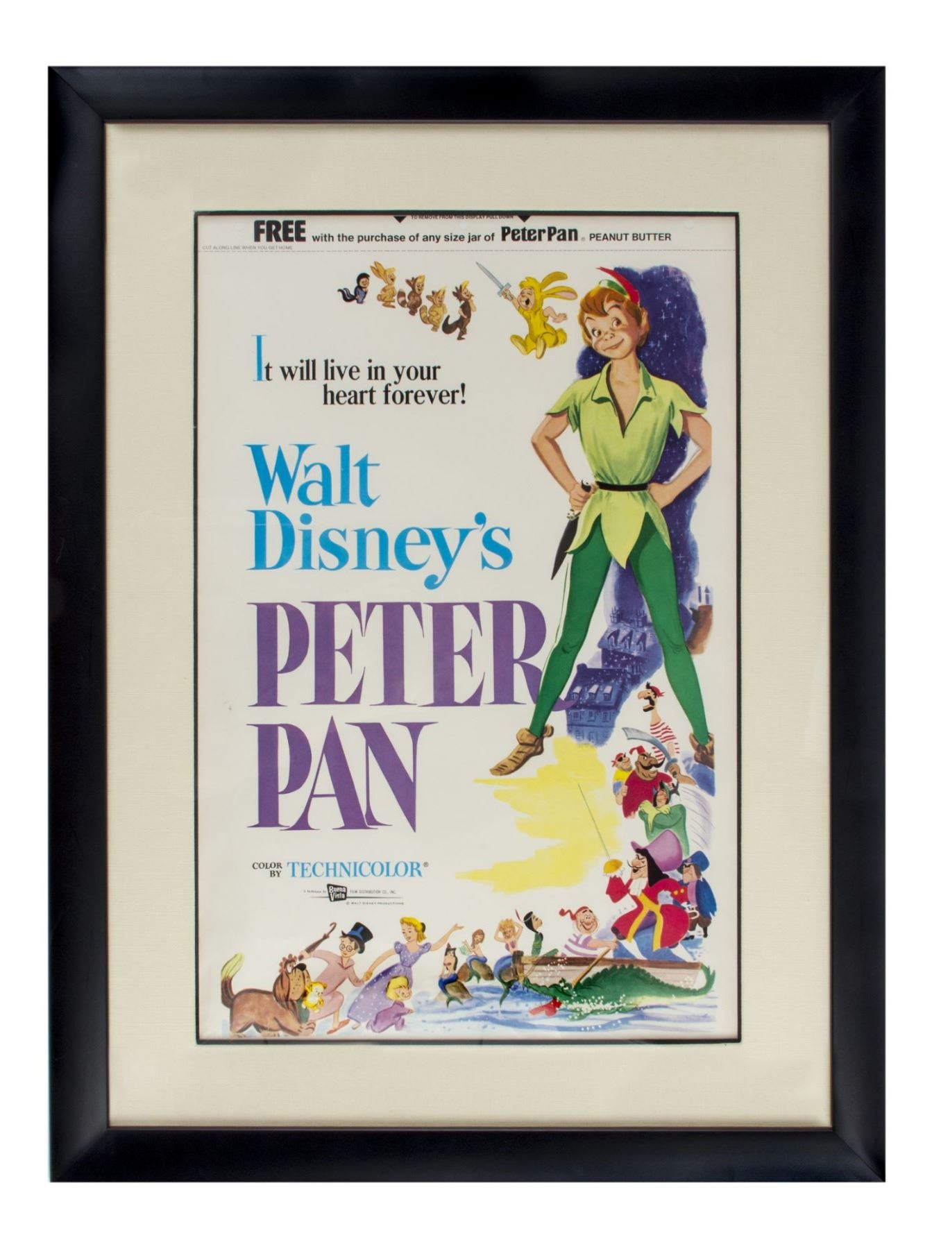 (Peter Pan Peanut Butter, 1958) An advertising poster for Walt Disney's "Peter Pan". This poster was offered as a premium with "the purchase of any size jar of Peter Pan Peanut Butter" in response to the theatrical re-release of the animated classic. The poster measures 21.25"x13.75" in a 28.75"x21.75" frame. The condition is very good with some minor scuffing to the surface of the frame.
