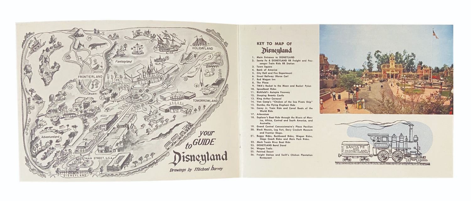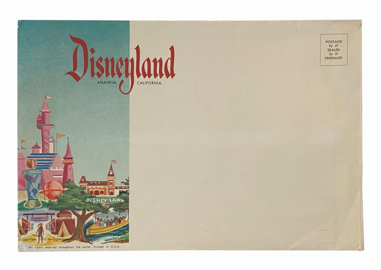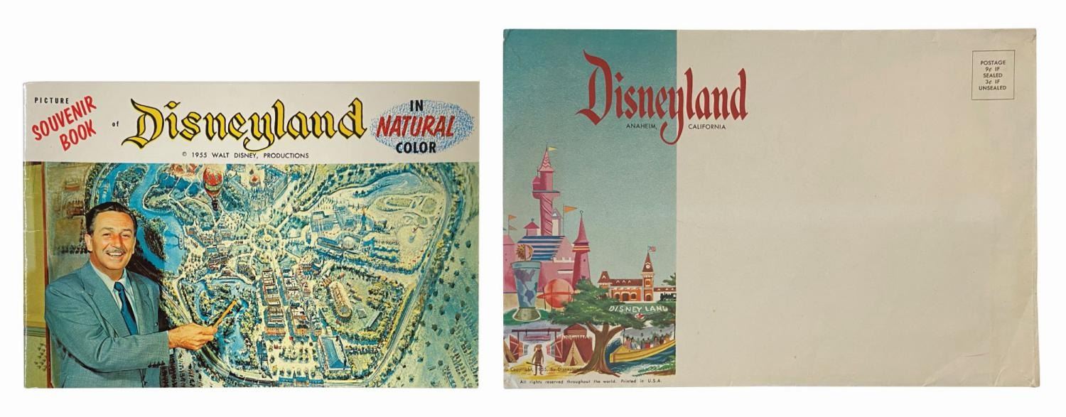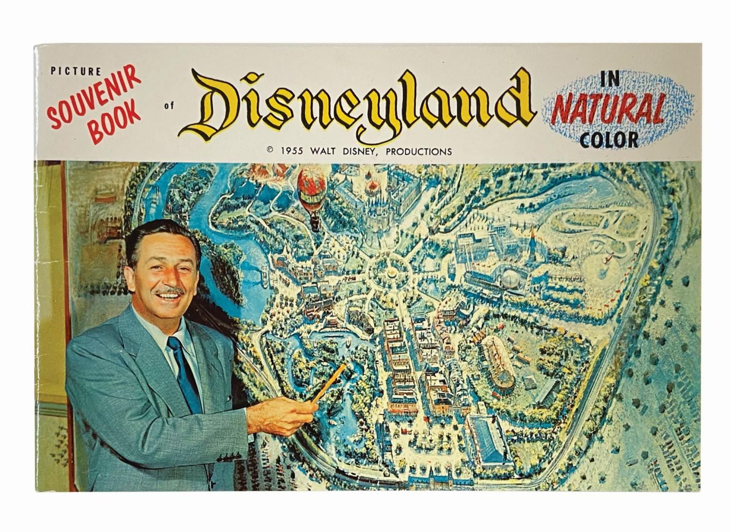 (Disneyland, 1955) A vintage copy of Picture Souvenir Book of Disneyland in Natural Color. The 23-page staple-bound book provides a land-by-land tour of the park and is illustrated throughout with wonderful early color photographs of iconic landmarks and attractions. An original Disneyland envelope featuring a printed color illustration of the park is included. The book measures 6"x8.75" and the envelope is 6.5"x9.5". Both are in very good condition with some minor edge and handling wear. The book has some light spidering along the spine.