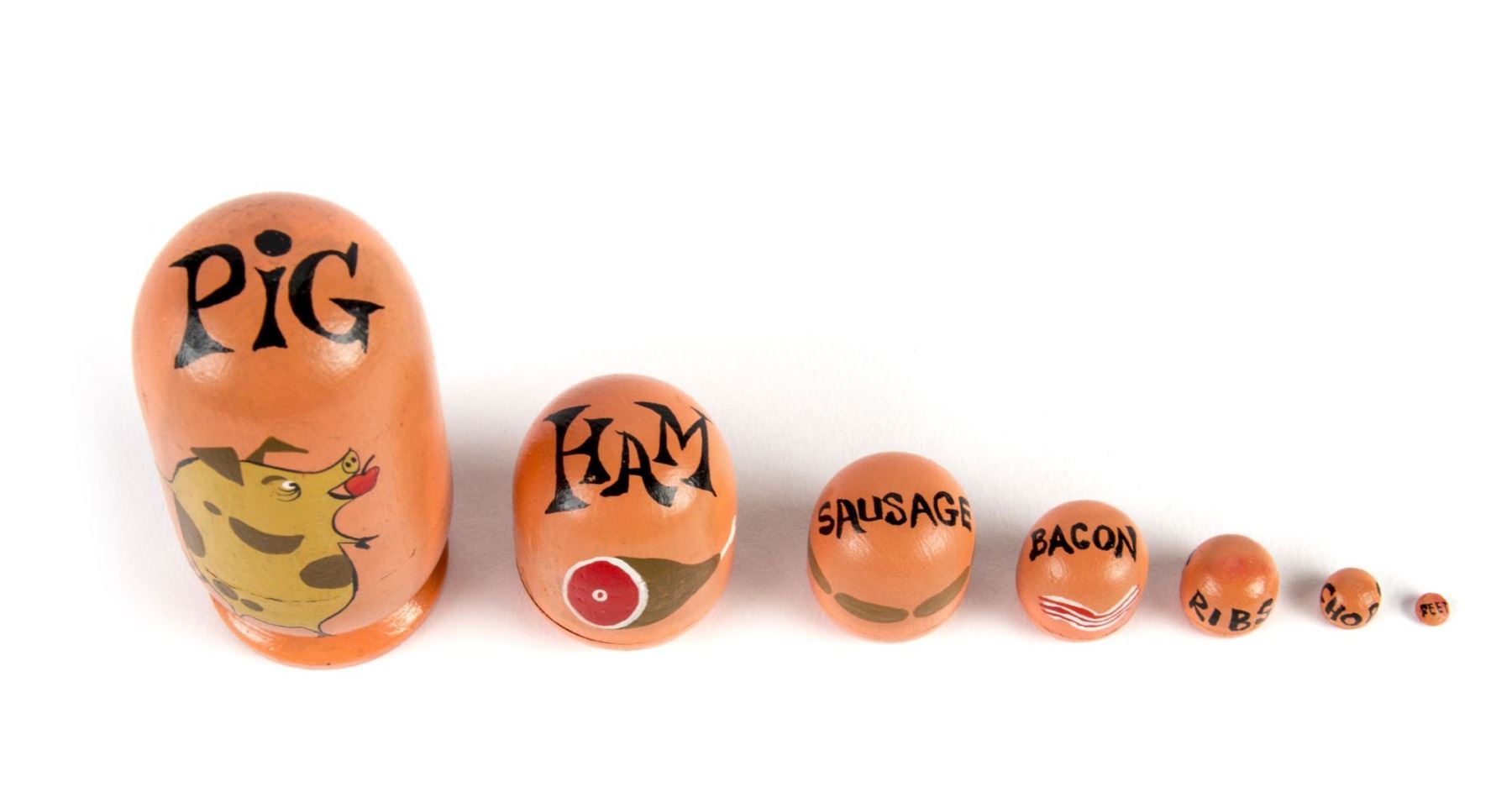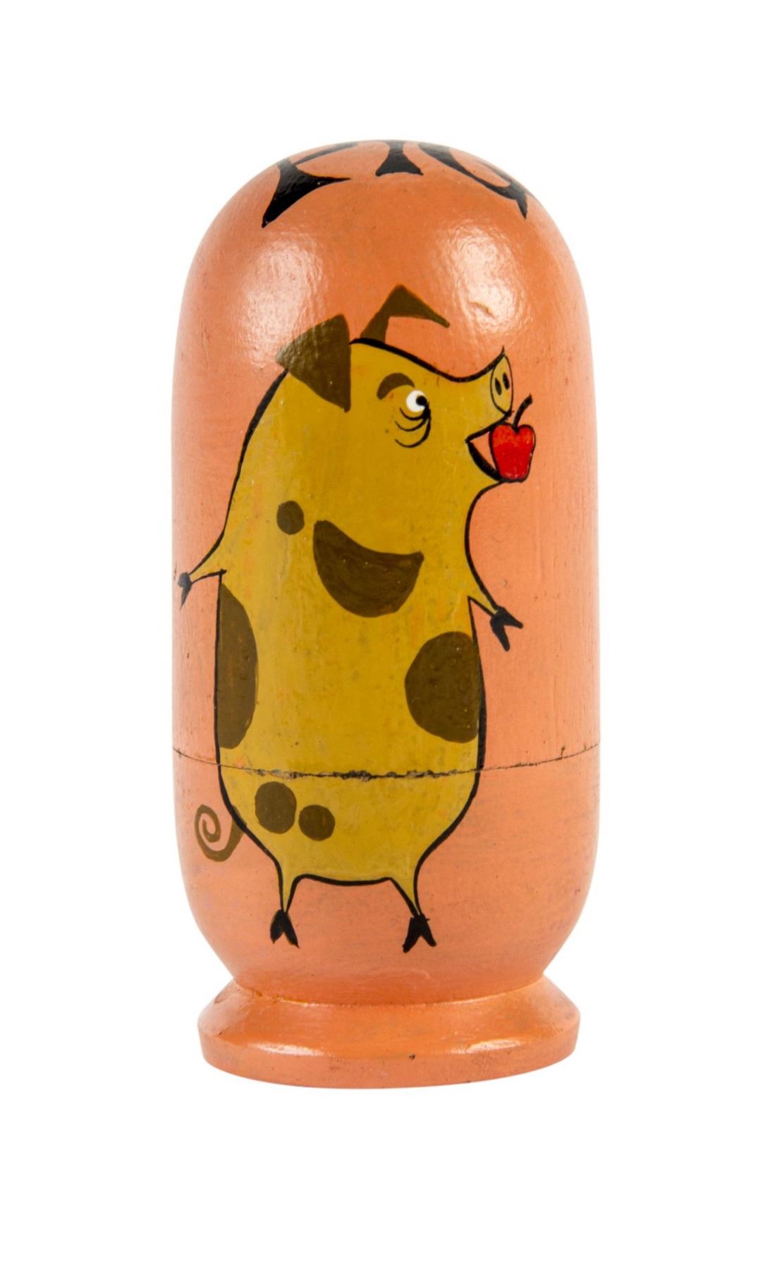 (1970s) An original nesting doll toy created and hand-painted by Rolly Crump. This nesting doll is shaped like a pig, and opens to reveal several pig parts such as "ham", "sausage", and "bacon". The toy measures 3.5" tall and is in very good condition with minor wear.
