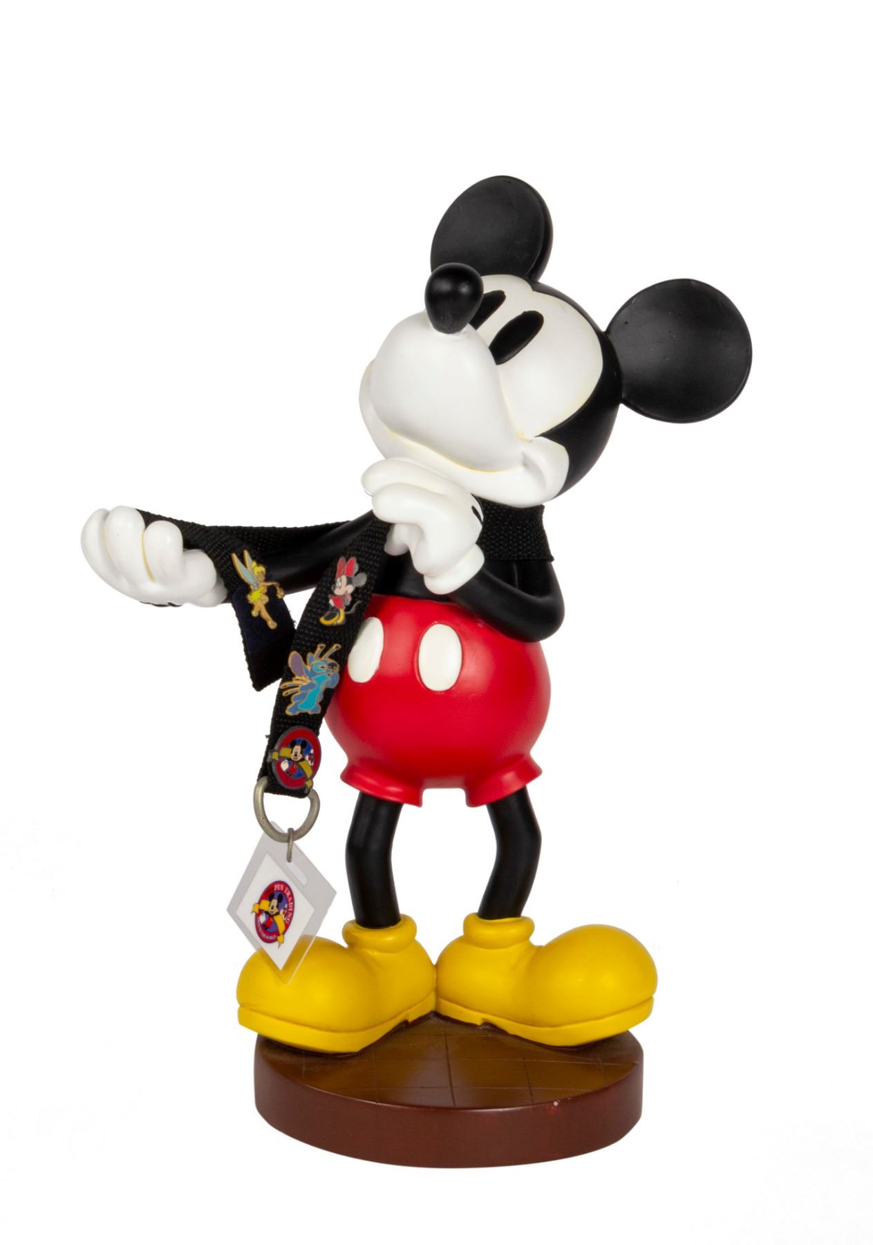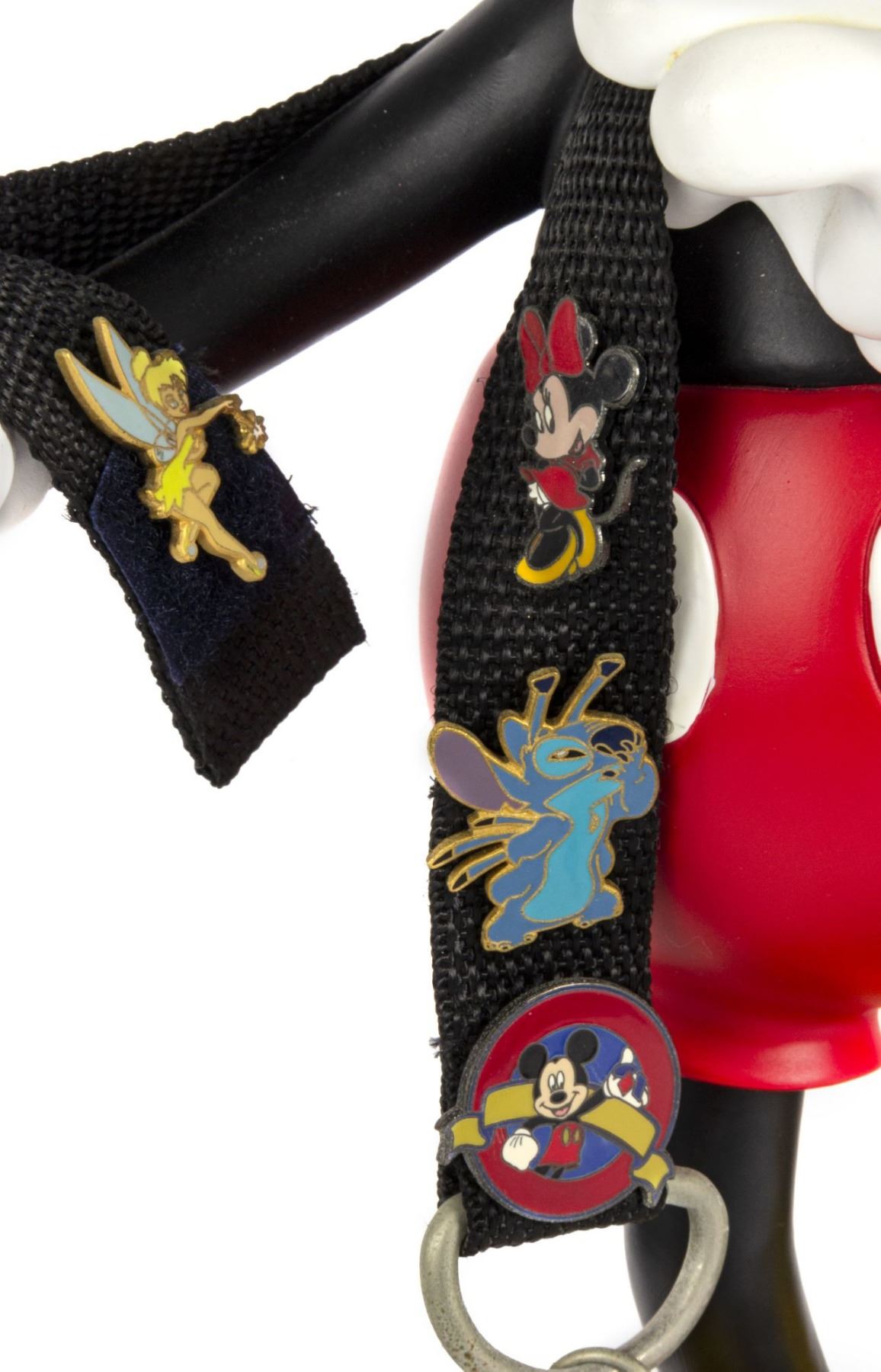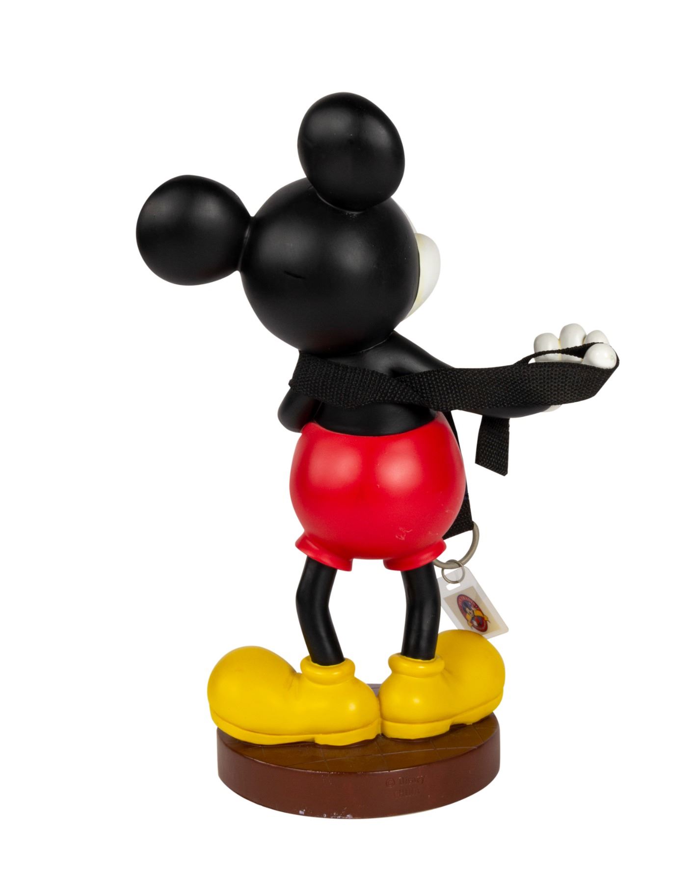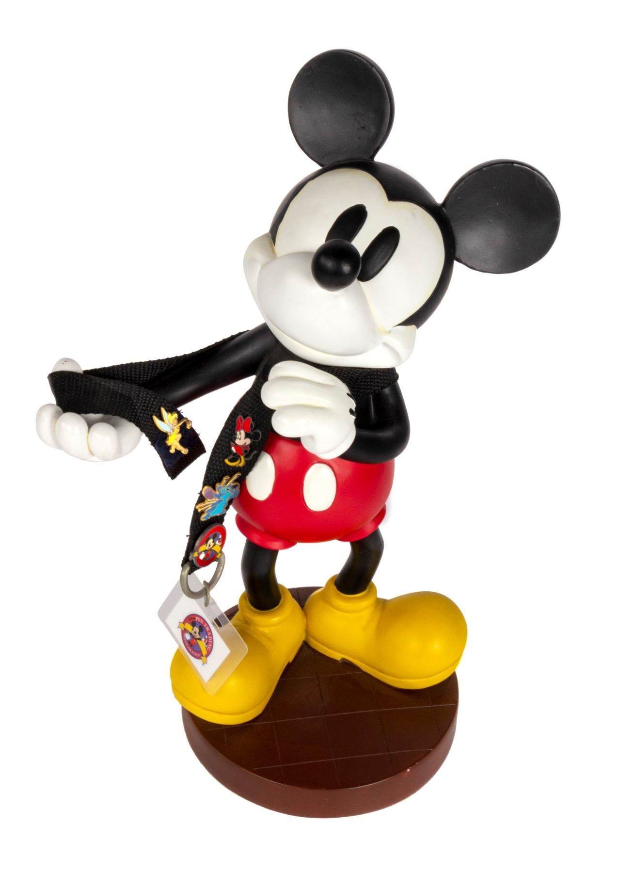 (Walt Disney Studios, c.2002) A wonderful sculpture depicting a pin-trading Mickey Mouse. Created as part of the Pin Trading Around the World celebration, this Mickey sculpture is holding a lanyard with (4) pins of Tinker Bell, Minnie, Stitch, and the logo for the event. Measuring 13" tall, the sculpture is in good condition overall with some minor surface wear throughout from previous display. This rare Mickey is a perfect addition for any Pin Collector.