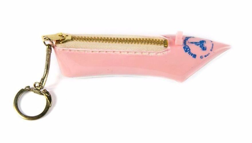 (Walt Disney World, 1970s) A souvenir shoe-shaped coin purse featuring the Walt Disney World logo on the toe. This pink coin-purse has a key-ring attached and measures approximately 5" long. This item is in very good condition with minor wear to the key ring.