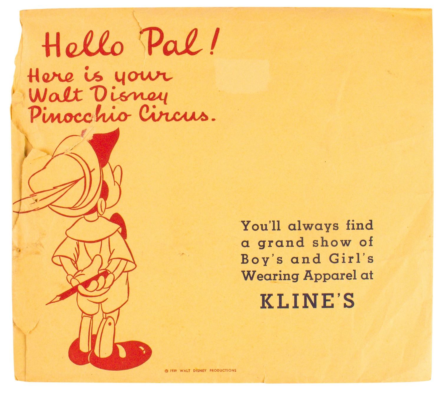 (Walt Disney Studios, 1939) A promotional "Pinocchio Circus" cut-out in its original envelope from Kline's Department Store. As part of the promotion for the movie, Disney would supply these promotional items custom printed for department stores and other retailers that opted to carry related merchandise. This set includes a cut-out circus tent with popular "Pinocchio" characters. The cut-outs range from 2.25"x3.5" to 12" in diameter in their 9.5"x10.5" envelope. The condition is very good with a few missing pieces, some wear from use, and some tearing to the edge of the envelope.