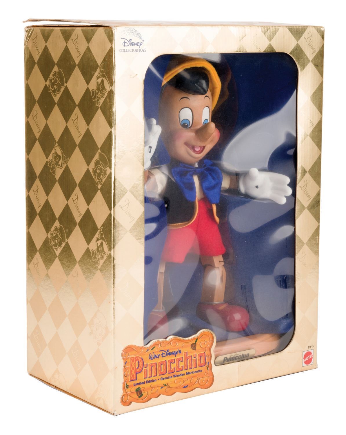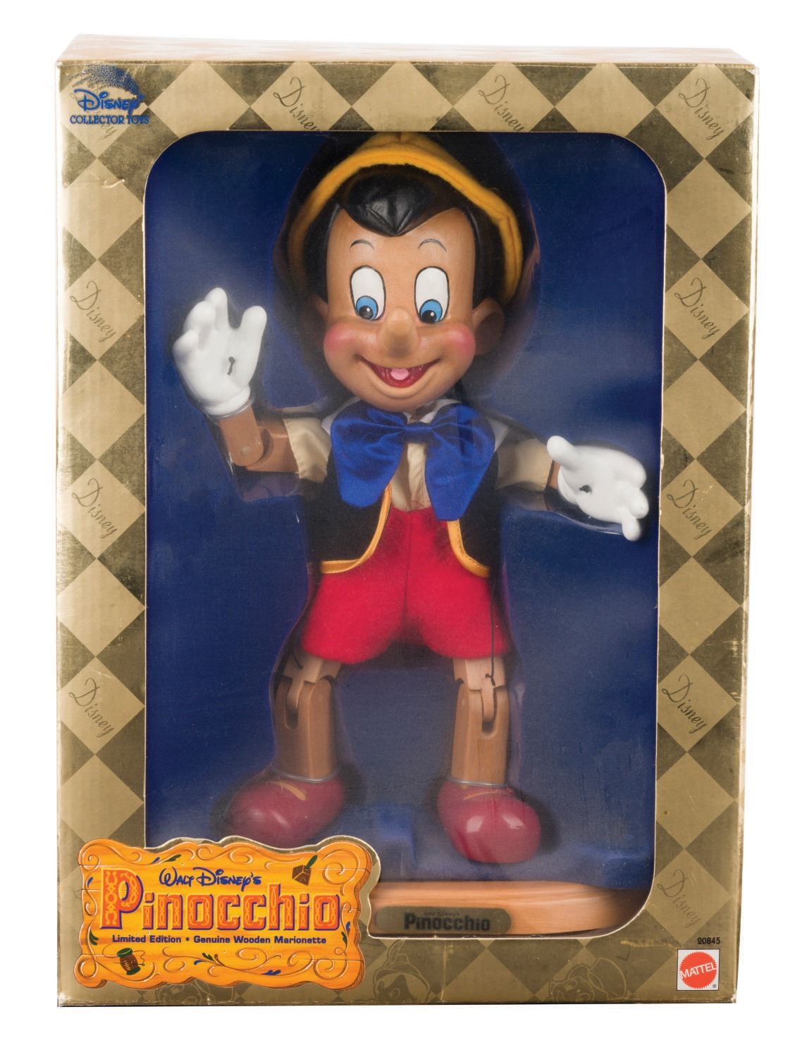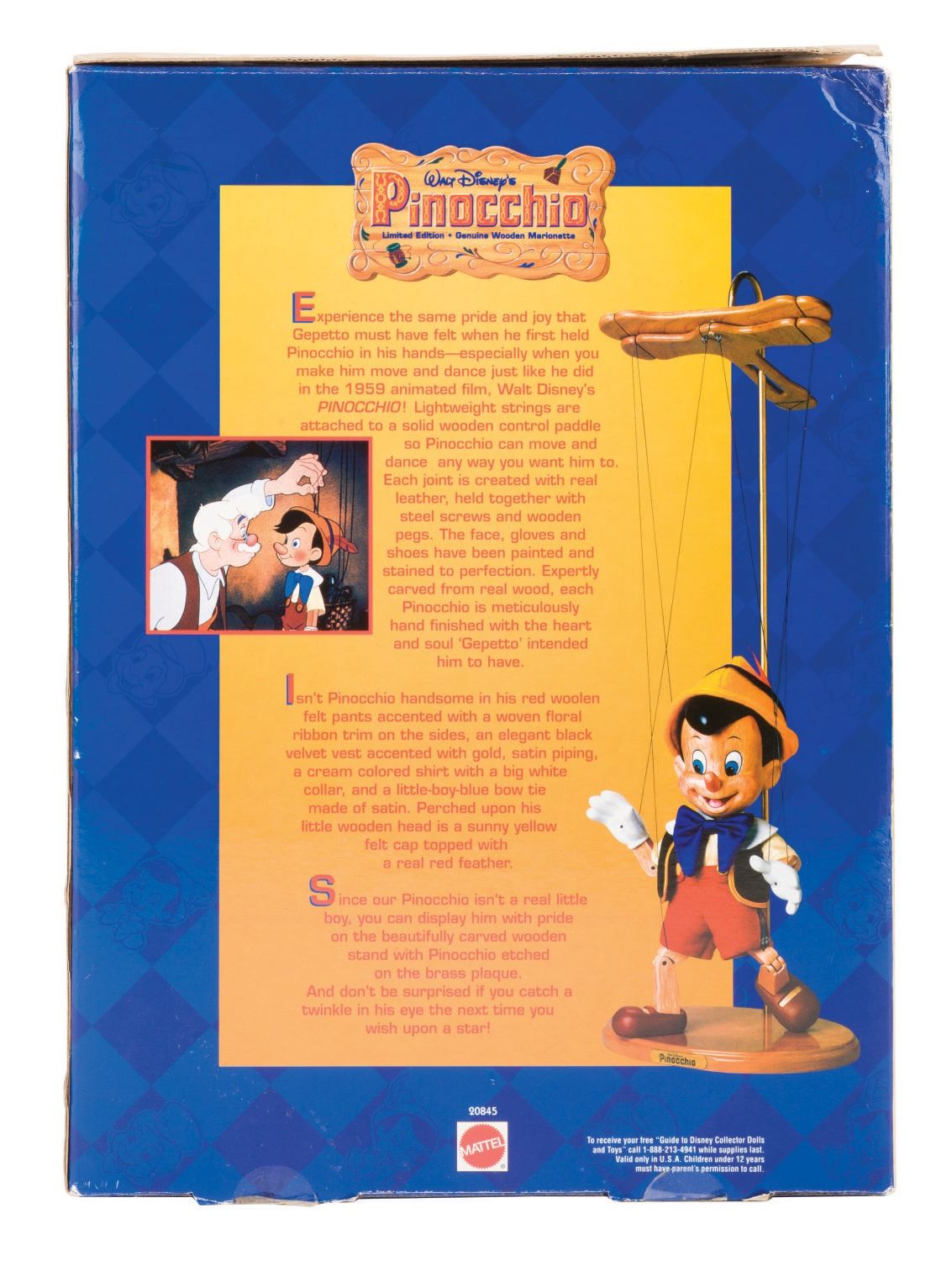 (Mattel, 1998) A Walt Disney's Pinocchio limited edition genuine wooden marionette. The jointed, wooden puppet figure with satin and felt clothing features a control paddle with lightweight strings and displays on a carved wooden stand with etched brass plaque. Measuring a total 30" tall (14"tall with display) and 9.5" at his widest diameter, the marionette is in fine condition with its original box.