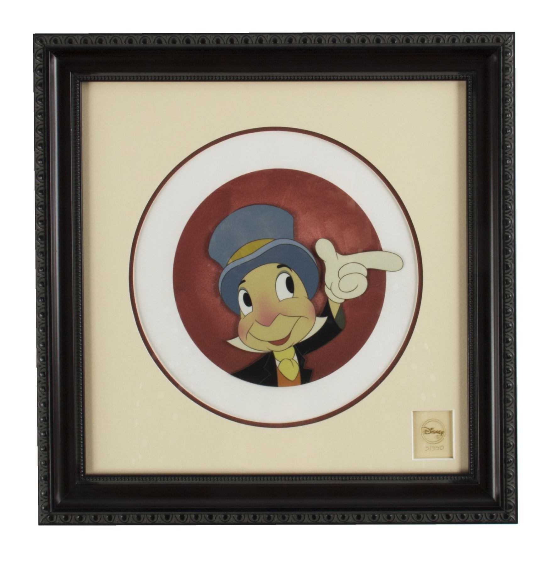 (Walt Disney Studios, 1998) A hand-painted limited edition cel of Jiminy Cricket that was created by Walt Disney Art Classics in the style of the original production cels sold by Courvoisier Galleries in the 1940s. The cel was created in acrylic paint by using original artwork and references from the film, with this cel recreating Sequence 3, Scene 50 of Pinocchio. Numbered 5/350, this cel measures 13.25"x13.25" within its frame. The cel includes its numbered corresponding limited edition model sheet and Certificate of Authenticity. The condition is very fine, with a very small scratch to the upper left part of the frame.