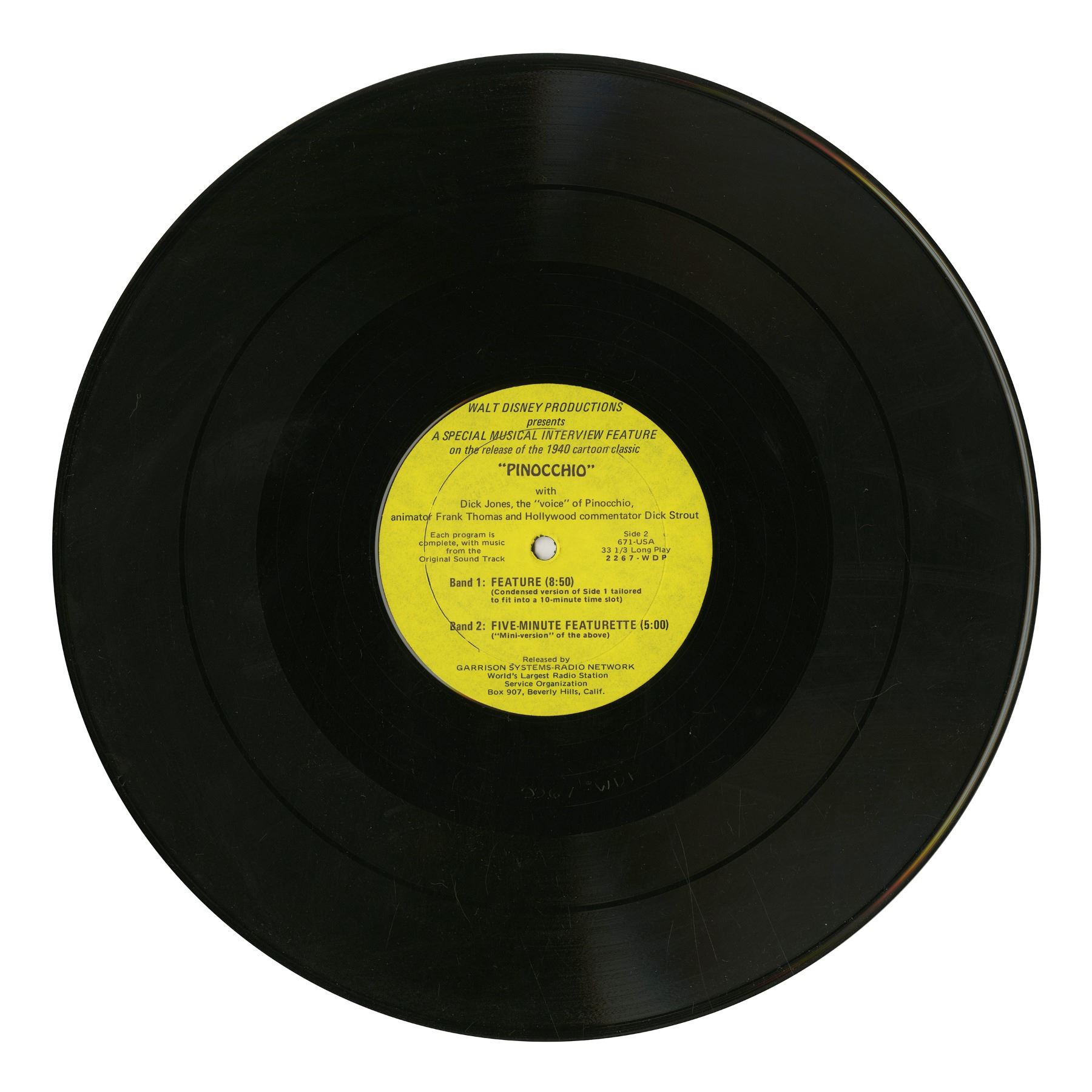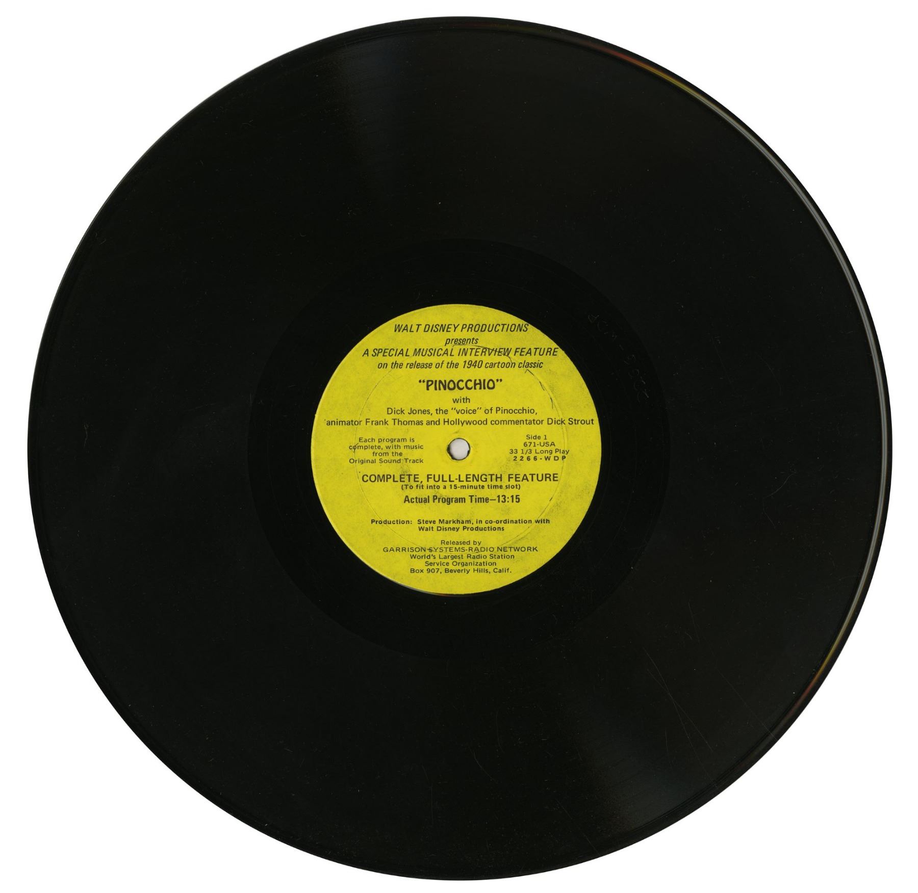 (Walt Disney Studios, 1940) A rare record developed for the Pinocchio promotional radio campaign featuring interviews with the stars, music from the film, and conversations with the animators. This record was designed to be played by radio stations to promote the feature film. The paper sleeve measures 12"x12" and is in fair to good condition with some tearing along the seams. The record itself is in very good condition.