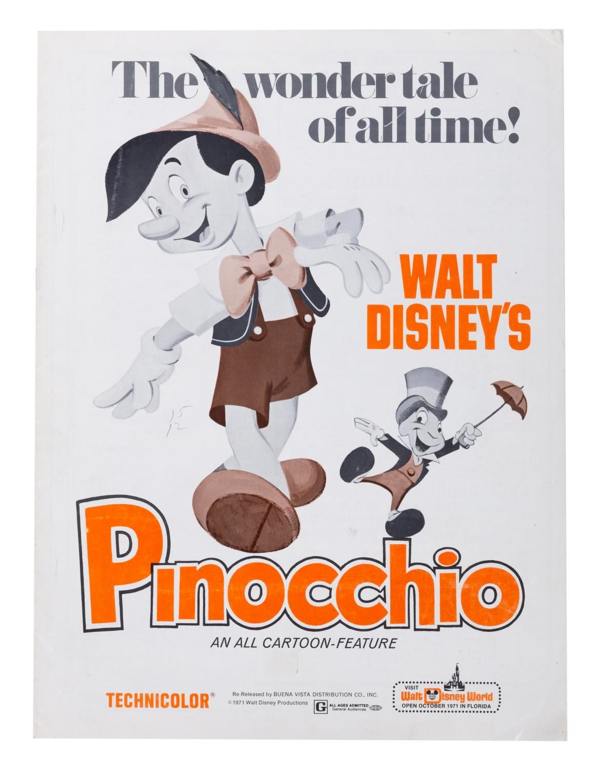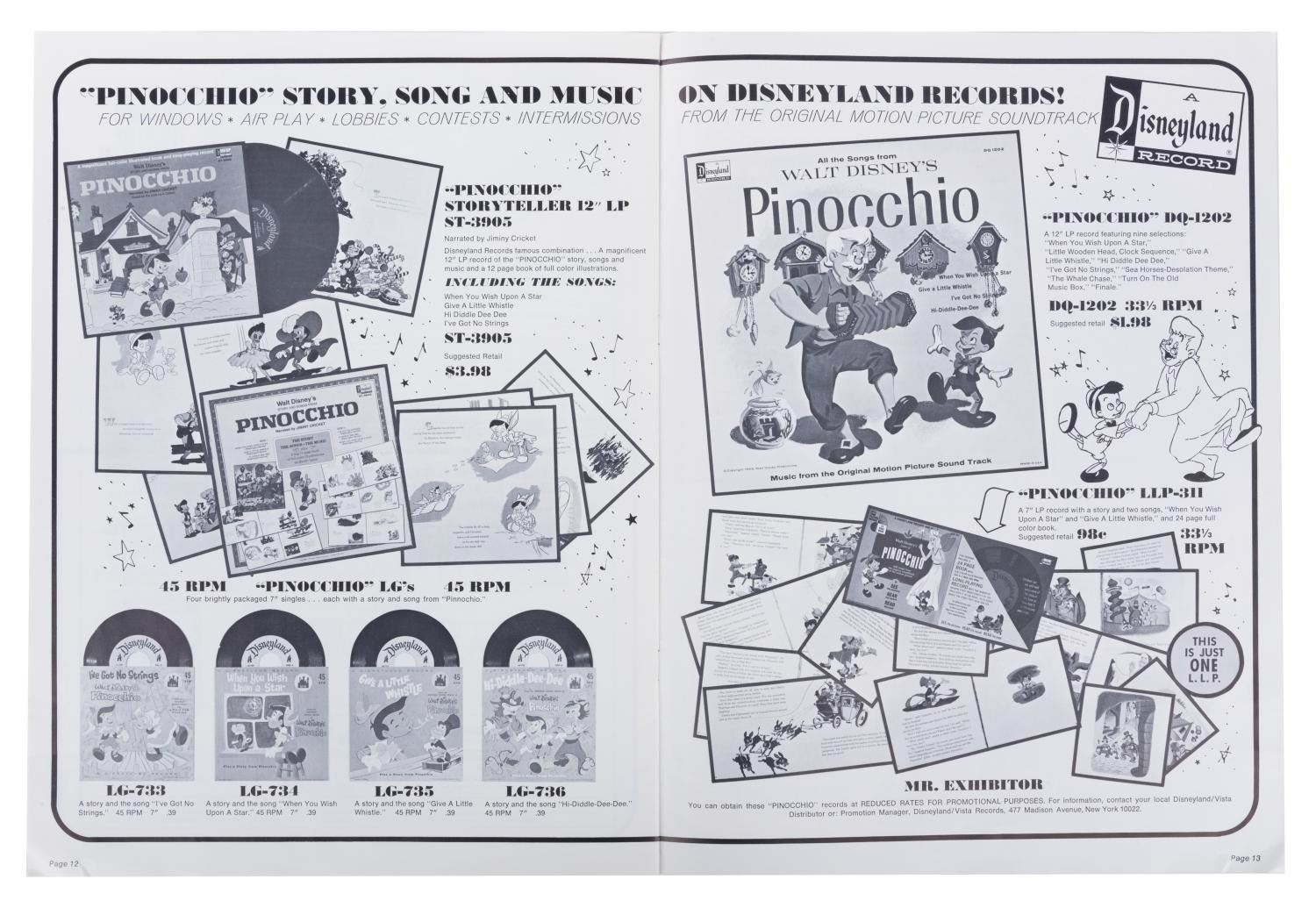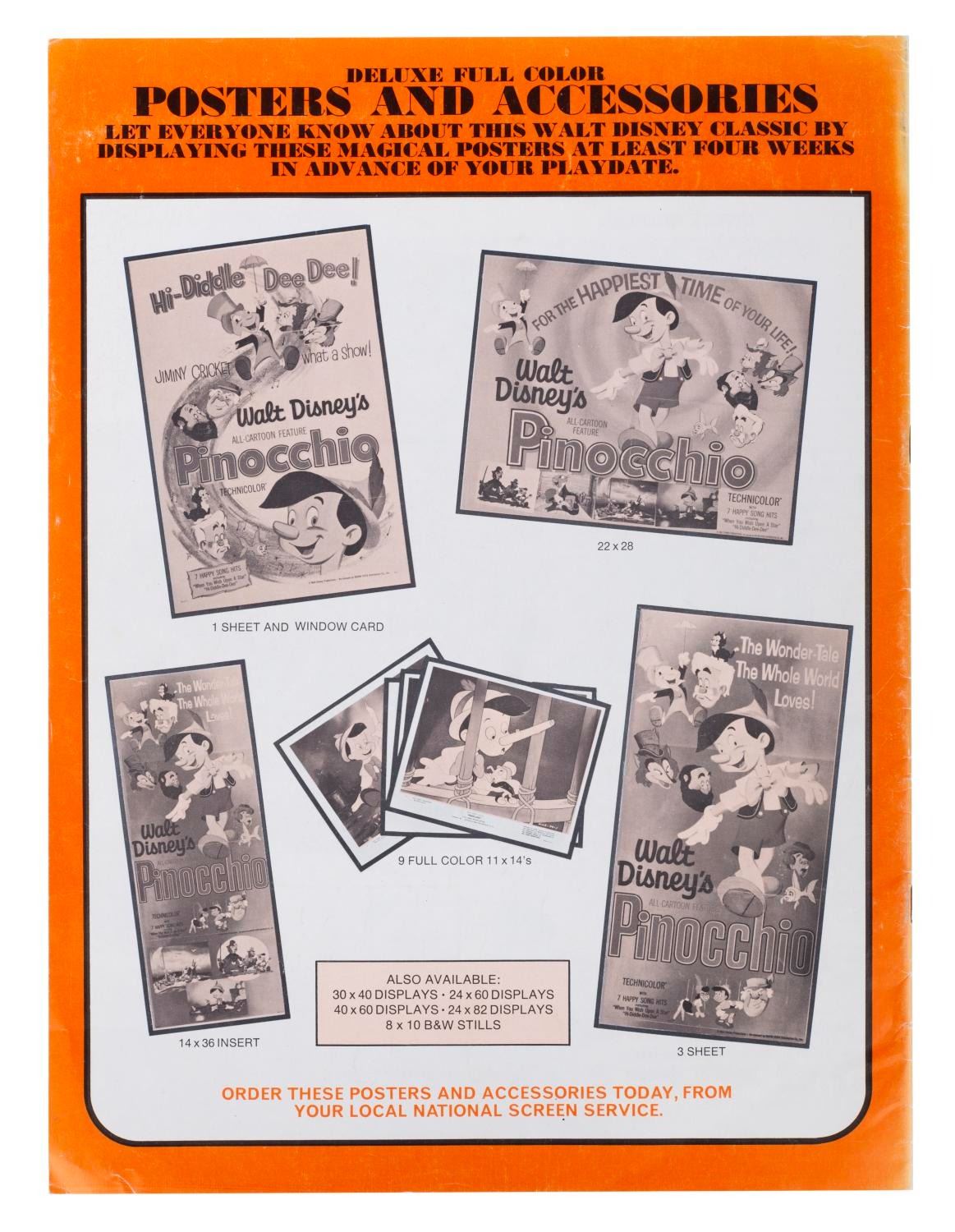 (Disney, 1971) An ad pad for the 1971 re-release of Walt Disney's "Pinocchio." The booklet includes advertisements for records, posters and accessories, publicity stories, tie-ins, and more related to the film's theatrical release. Measuring 11" x 15", the booklet is in very good condition, with slight wear and creases to the edges and corners.