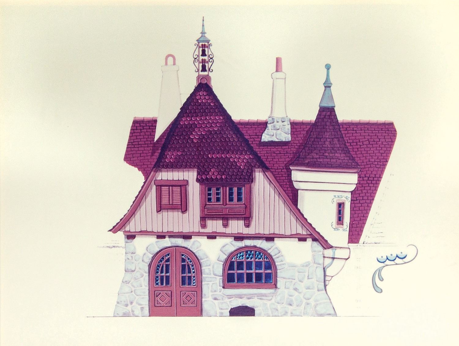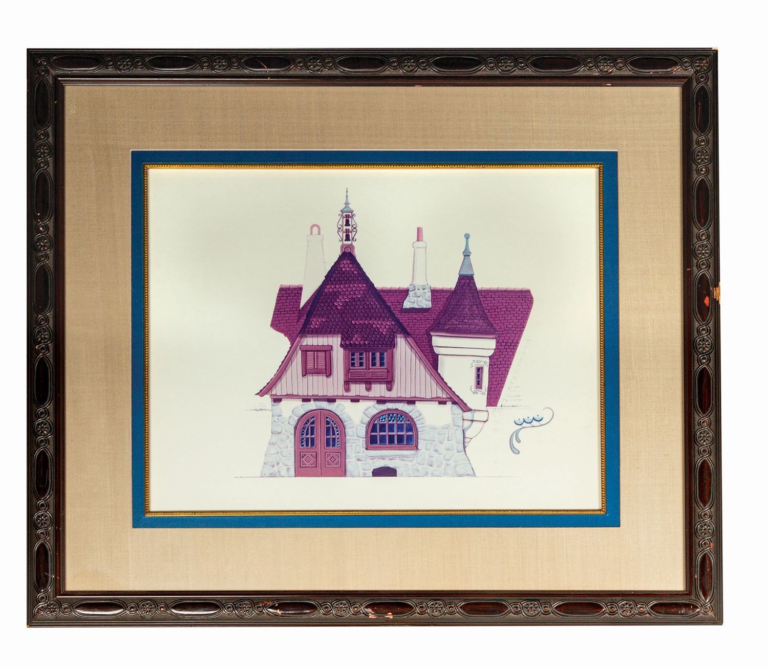 (Walt Disney World, c.2000s) A framed print of Pinocchio's Village Haus restaurant at Walt Disney World. The print depicts the elevations of the restaurant, and is believed to have been used at one of the Disney hotels or offices. The print has an image size of 14.5"x18.5" within its 24.75"x28.75" frame. The print has not been examined out of frame, but appears to be in very good condition. There are small chips and some general surface wear to the frame from previous display. Due to the glass used in the frame, special shipping arrangements may apply. Please inquire for details.