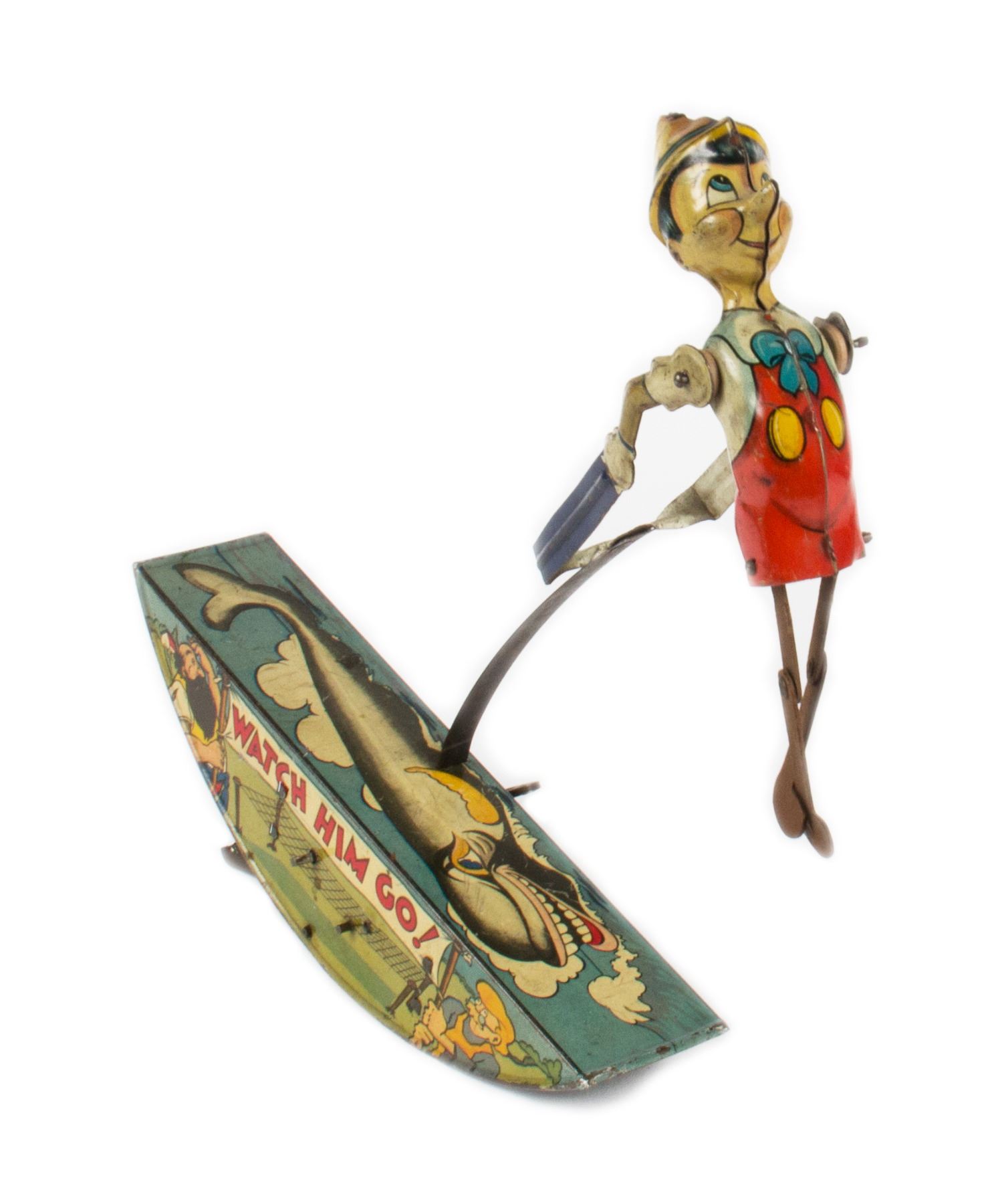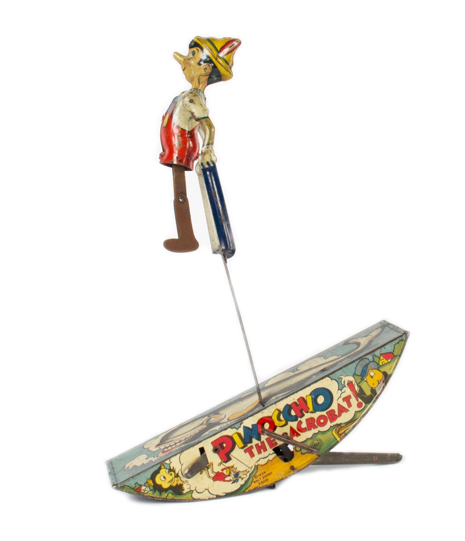 (Marx, 1939) A rare tin toy created by Marx titled, "Pinocchio the Acrobat!" The base of the toy has a metal turnkey that causes the base to rock back and forth, which in turn makes Pinocchio perform aerial tricks. The toy measures 17" tall when assembled and is in fair to good condition with some areas of discoloration and surface wear from use and age.