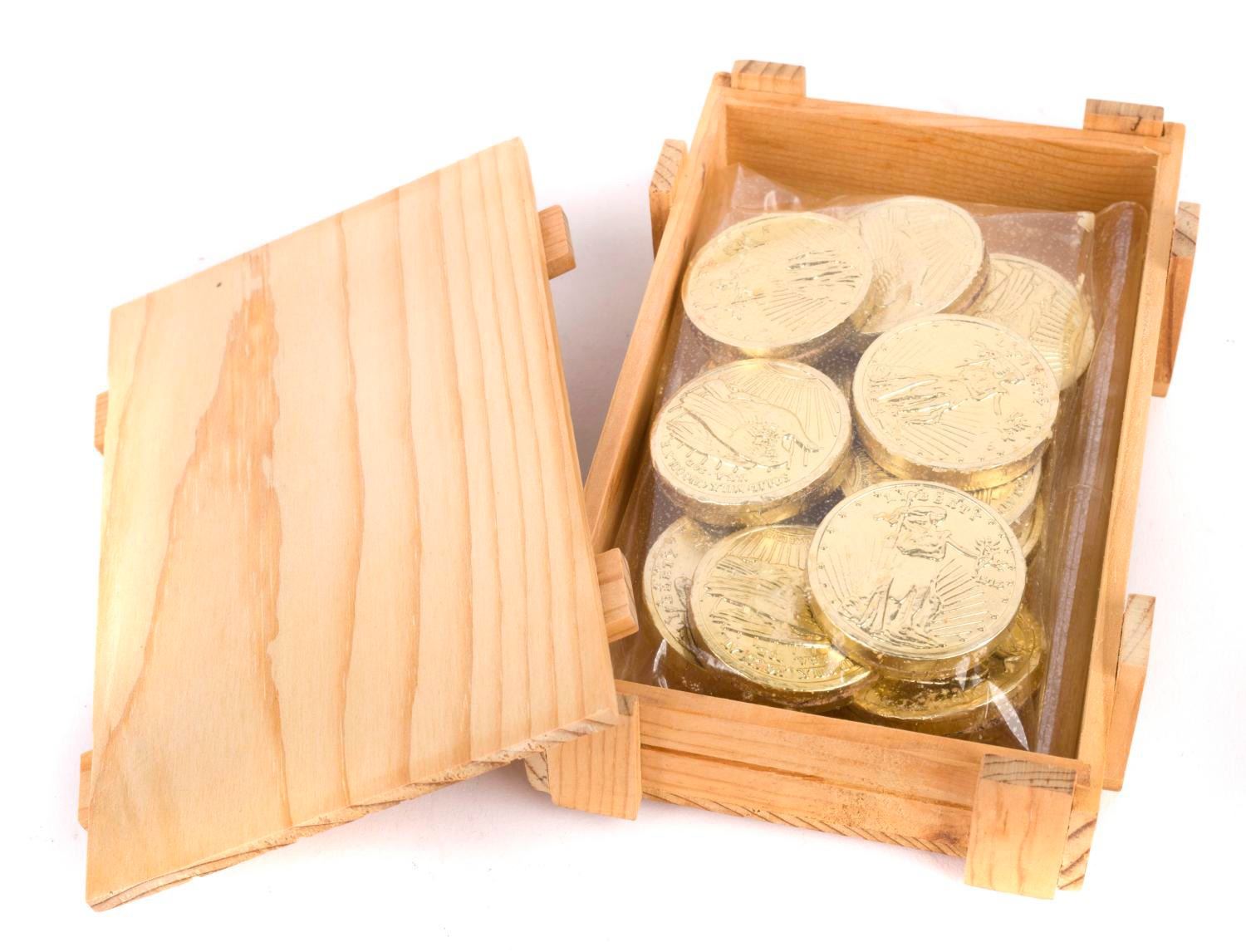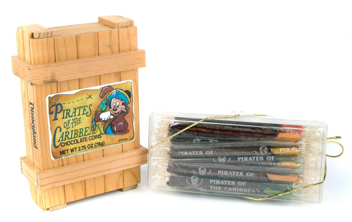 (Disneyland) A pair of Pirates of the Caribbean candies. Among the lot are chocolate dipped candy and candy coins in a collectible wooden crate. The candies and packages are in fine condition but expired.