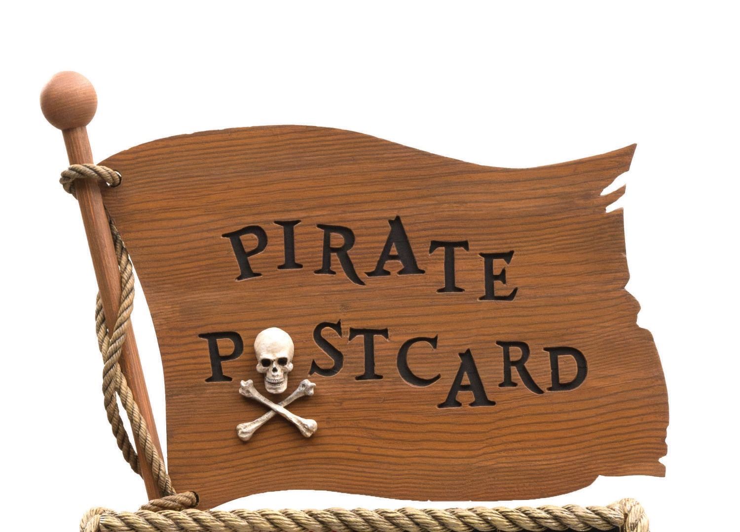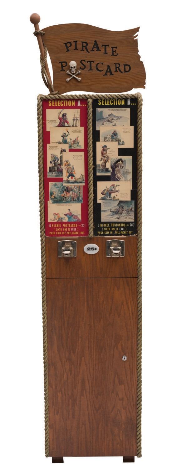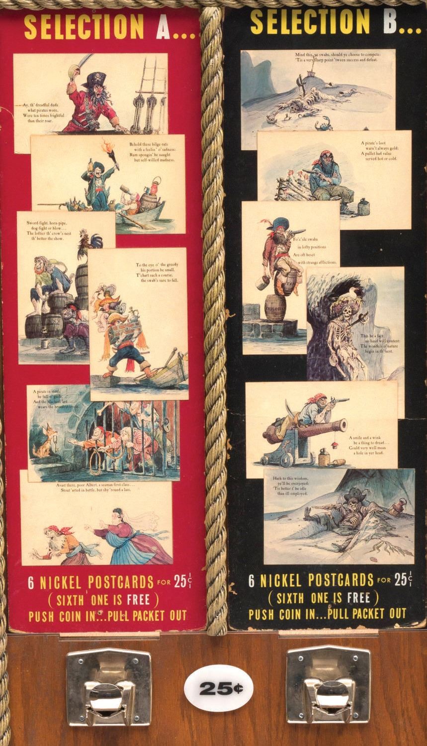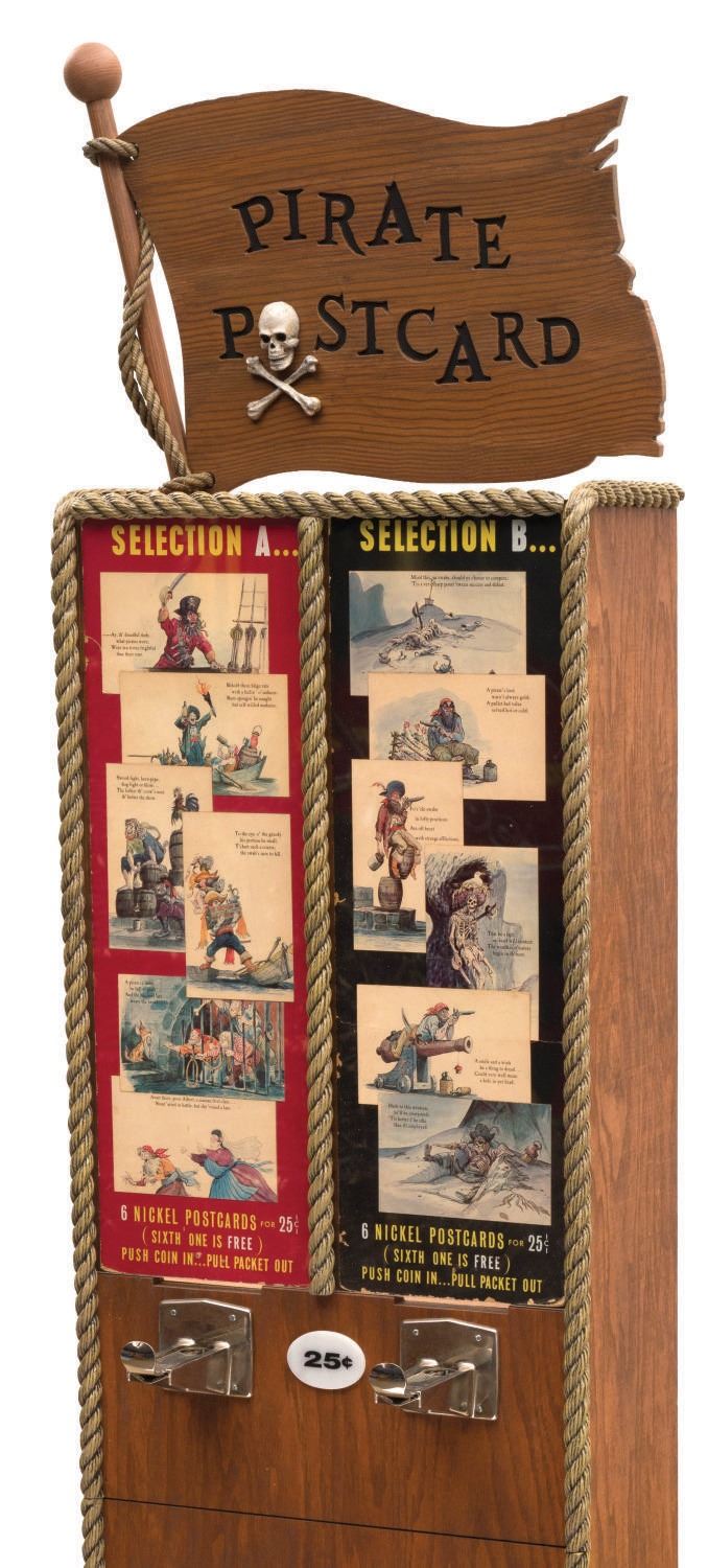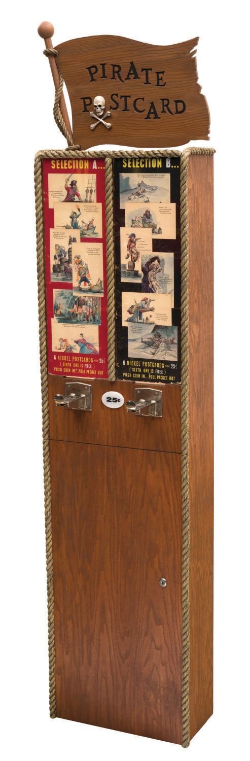 (Disneyland, 1967) A pair of original plexiglass marquee displays from the Pirates of the Caribbean Postcard Dispenser at Disneyland. The pieces were once part of the original machine that was stationed in the Pirate Arcade in New Orleans Square in 1967, and pre-date the opening of the Pirates Of Caribbean attraction. Offered in two sets of six for $.25 each, the marquee displays each of the cards. Each of the marquee display pieces have been mounted for display within a custom display stand inspired by the façade of the original machine. This custom display is inspired by the original machine and features ‘rope' edging, pirate flag topper, and frames the famed Marc Davis Pirates Postcards which consisted of imagery from his concept art for the attraction. Measuring 17"x13"x62.5" high, the display (with original artifacts) is overall in very good condition. Due to size and weight, special shipping arrangements are required. Please inquire before bidding.