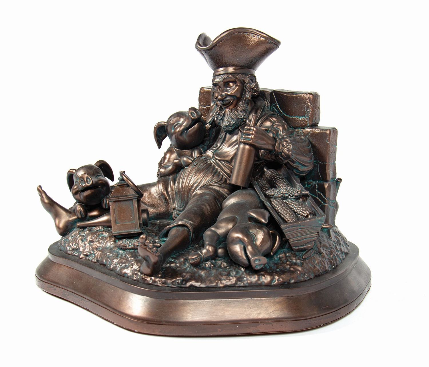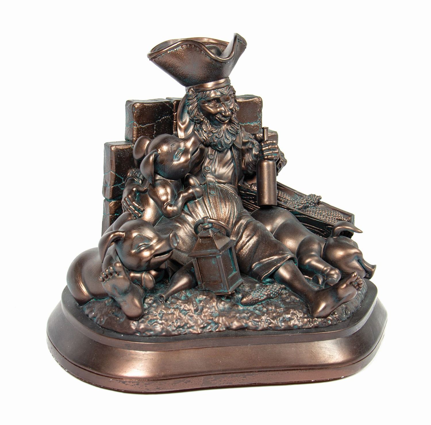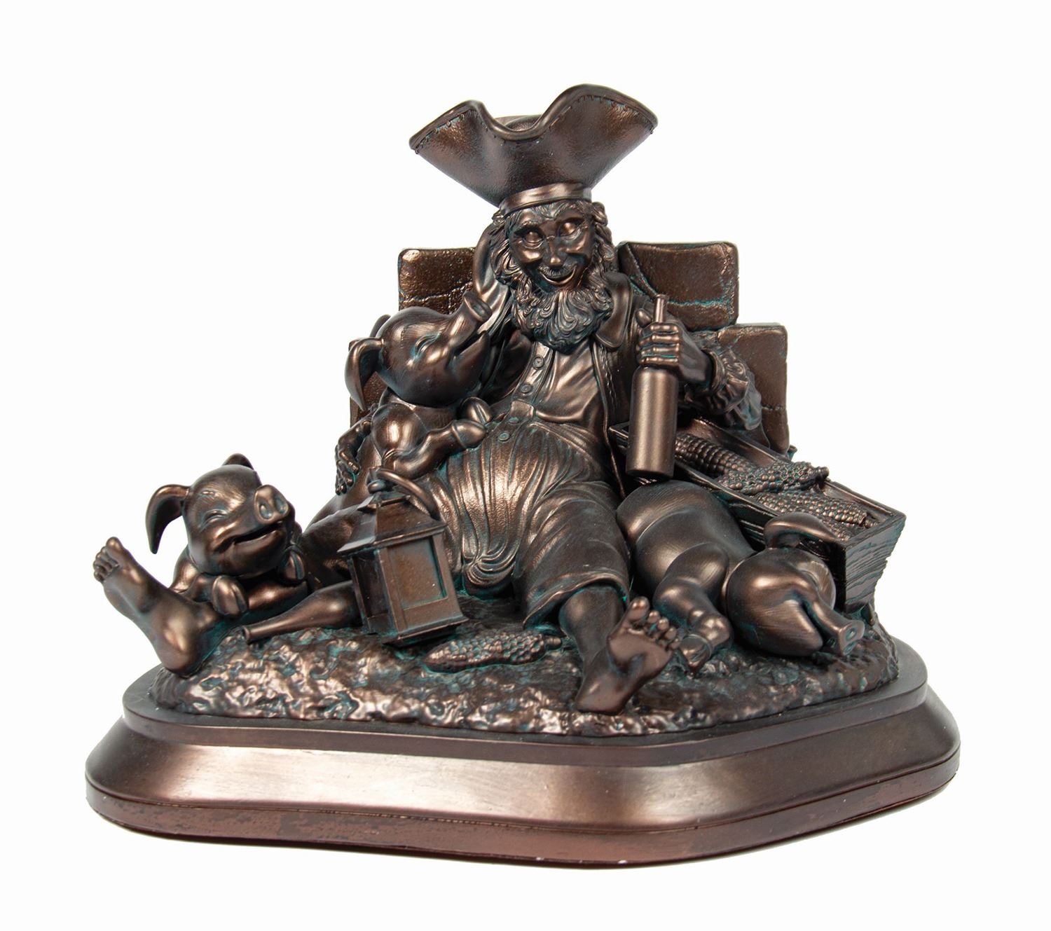 (Disneyland, 2017) A limited edition Pirates of the Caribbean figure by artist Derek Lesinski. Created to celebrate the 50th anniversary of the attraction, the figure is constructed of cast resin painted a metallic bronze on an integral wooden base. The piece depicts the drunken pirate lounging with pigs from one of the most memorable tableaux in the ride. Released in a limited edition of only 50, the piece retains a Disney Certificate of Verification and is stamped on the felt bottom of the base with The Art of the Disney Parks and edition information. The original cardboard box packaging is included. Measuring 8.75”x10” and 10.25” deep, the piece is in very good condition. The hoop lantern handle has been reattached.