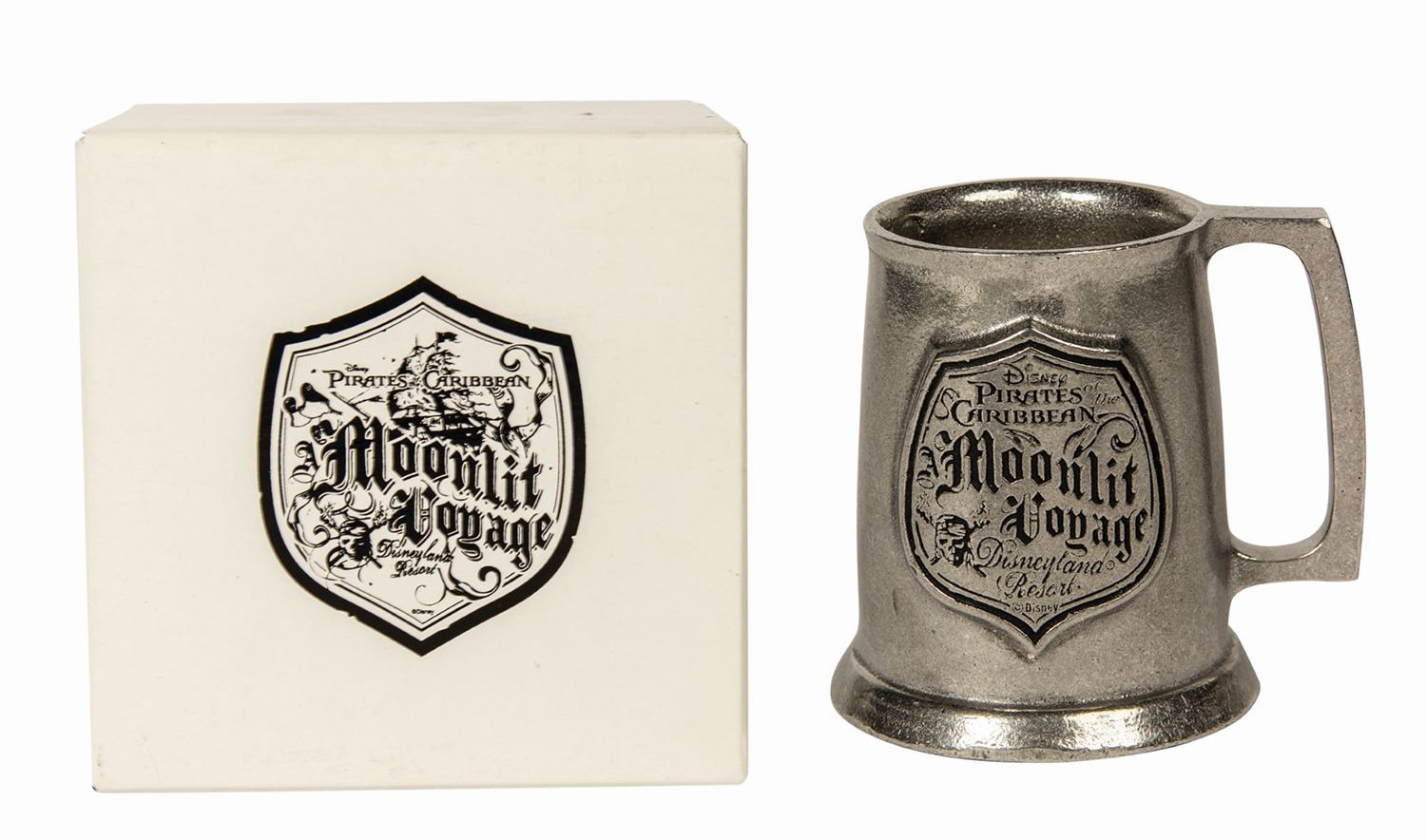 (Disneyland, 2006) An ale mug created for the "A Moonlit Voyage" Pirates of the Caribbean event celebrating the release of the feature film Pirates of the Caribbean: Dead Man's Chest. The Statesmetal mug has a shield on the side with the event's logo and includes instructions on how to properly age the mug. Measuring 4.75" tall, the mug is in very good condition with minimal wear and comes in its original box. There is significant staining on one side of the box, but it does not affect the mug.