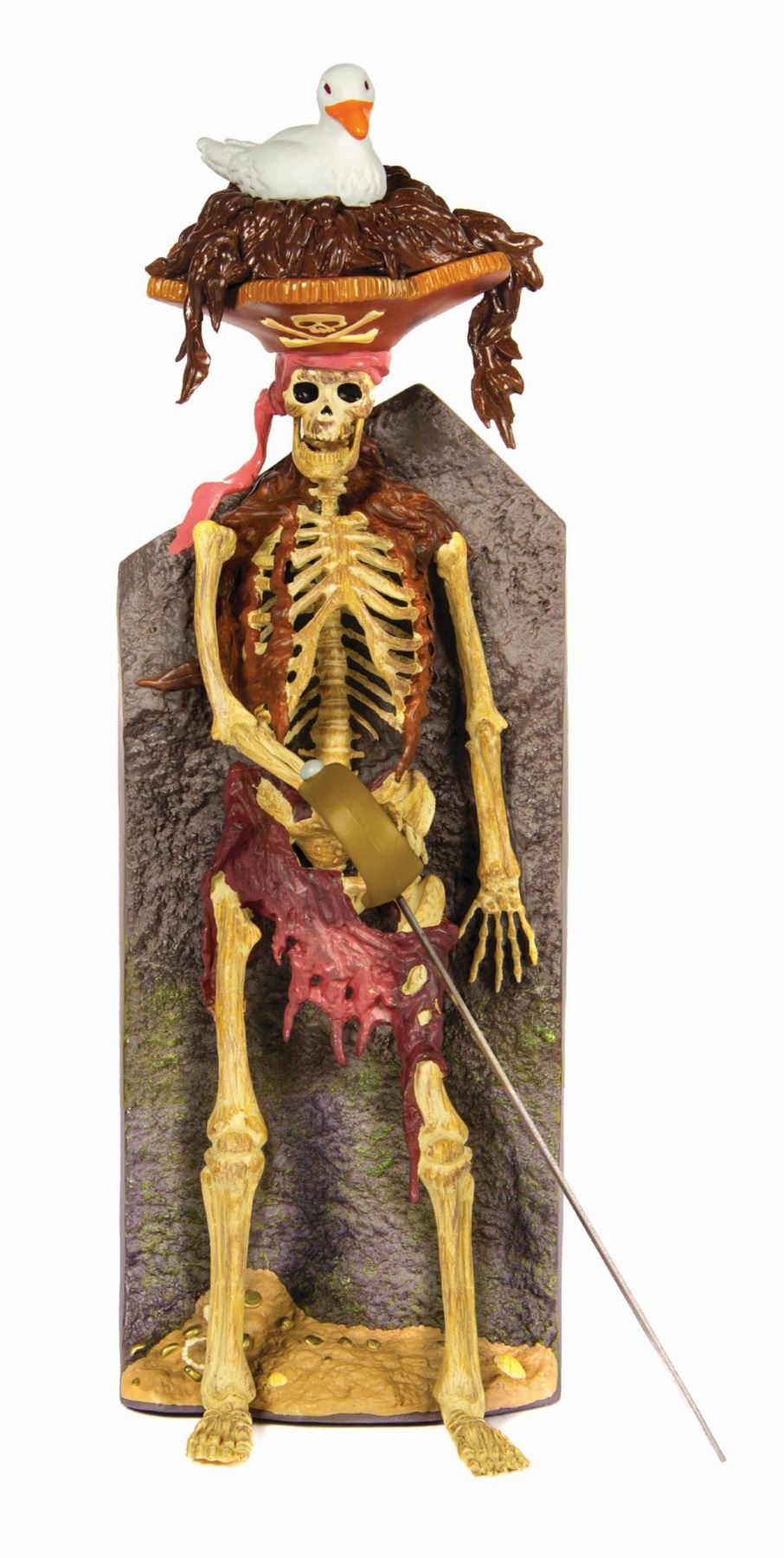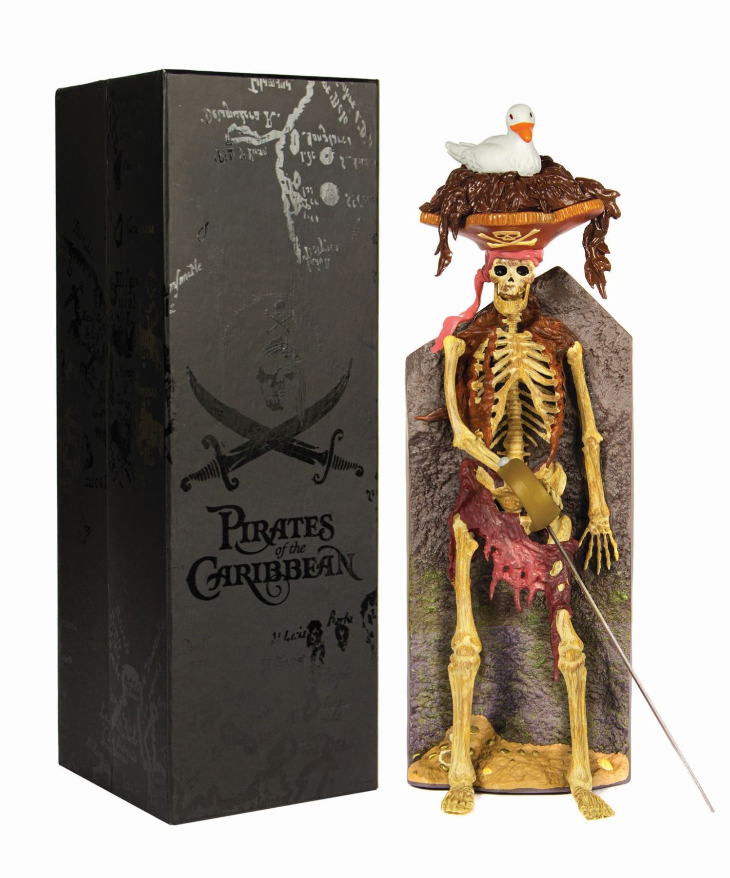 (Disneyland, 2008) A vinyl figure of the skeleton with a bird on its head as seen early in the Pirates of the Caribbean attraction. Created by Span of Sunset, the figure includes two metal swords, and has the attraction's opening narration printed on the reverse of the figure. Measuring approximately 15.5" tall, the figure is in fine unused condition and comes in its original box, which has some minor wear.