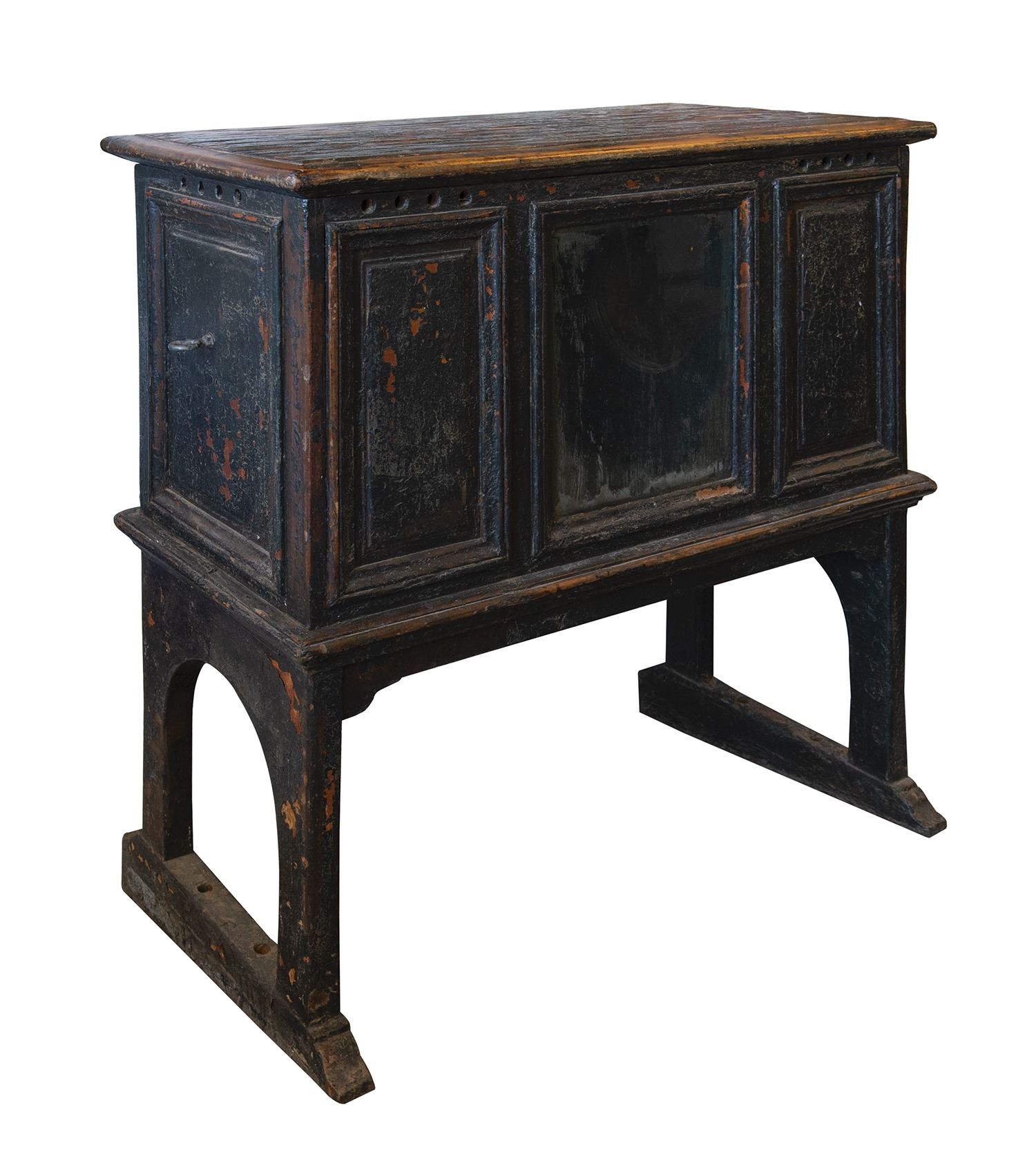 (Disney, 2006) A custom built prop curio table used in Pirates of the Caribbean: Dead Man's Chest. This large prop was located on the deck of the Black Pearl, directly in front of the ship's helm. The hand-painted and intentionally distressed piece looks as if it has weathered many years exposed to the elements at sea. The fitted wooden top can be removed, allowing one to easily display a prized Pirates-themed treasure behind the grimy glass in the center. Film production required the item to be constructed at a slight angle, so while sturdy, it presents slightly forward. It measures 46.75"x45" and 21" deep. This item may require special shipping conditions, please inquire for details and estimates.