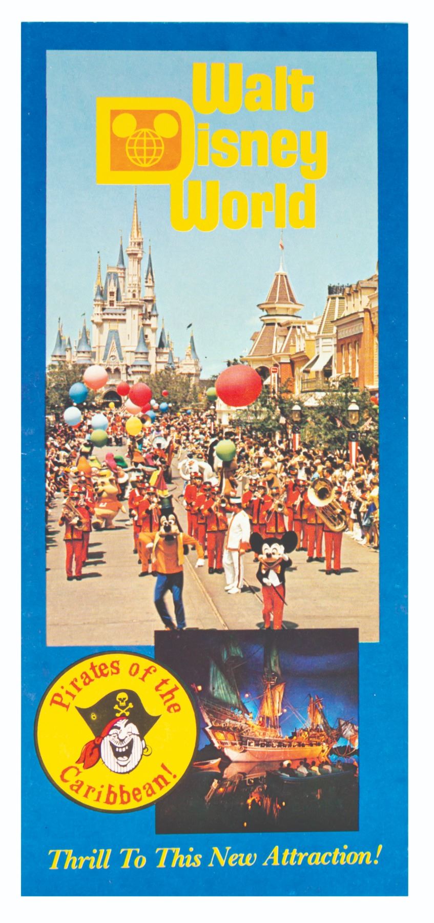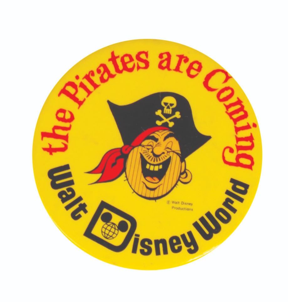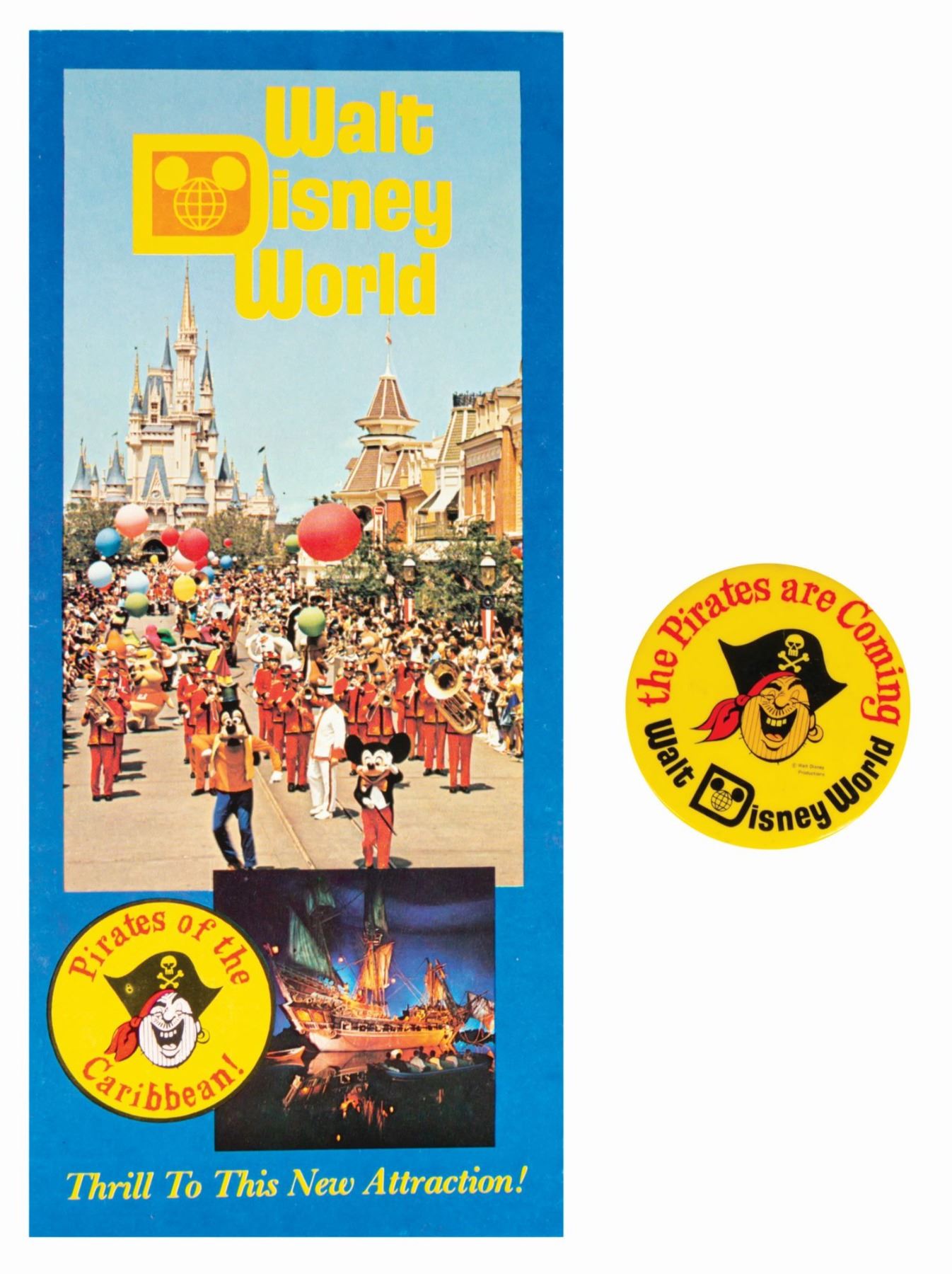 (Walt Disney World, 1974) A very rare brochure and button promoting the opening of Pirates of the Caribbean attraction at Walt Disney World. The button measures 2.25" in diameter and the brochure measures 9"x20" unfolded. The condition is very good with minor wear.