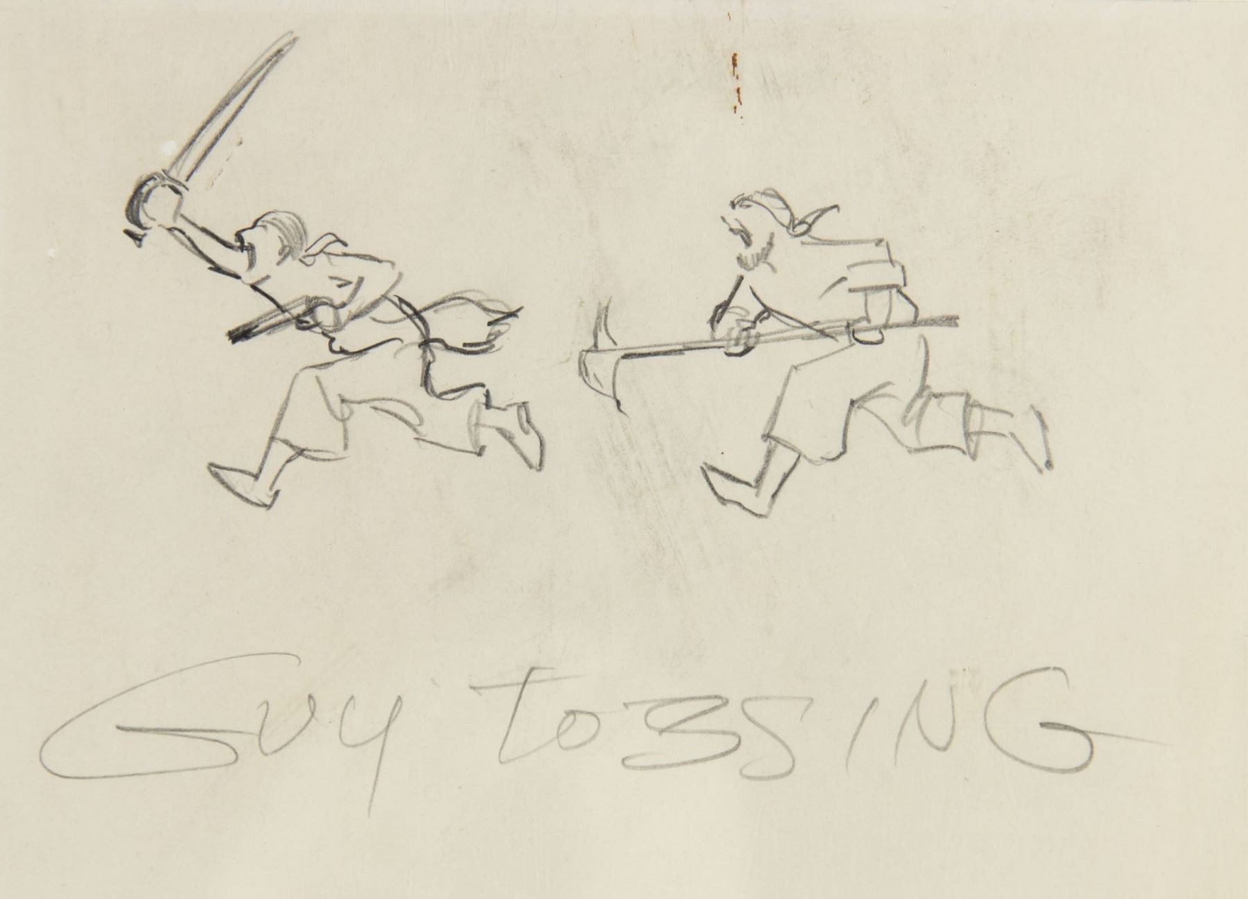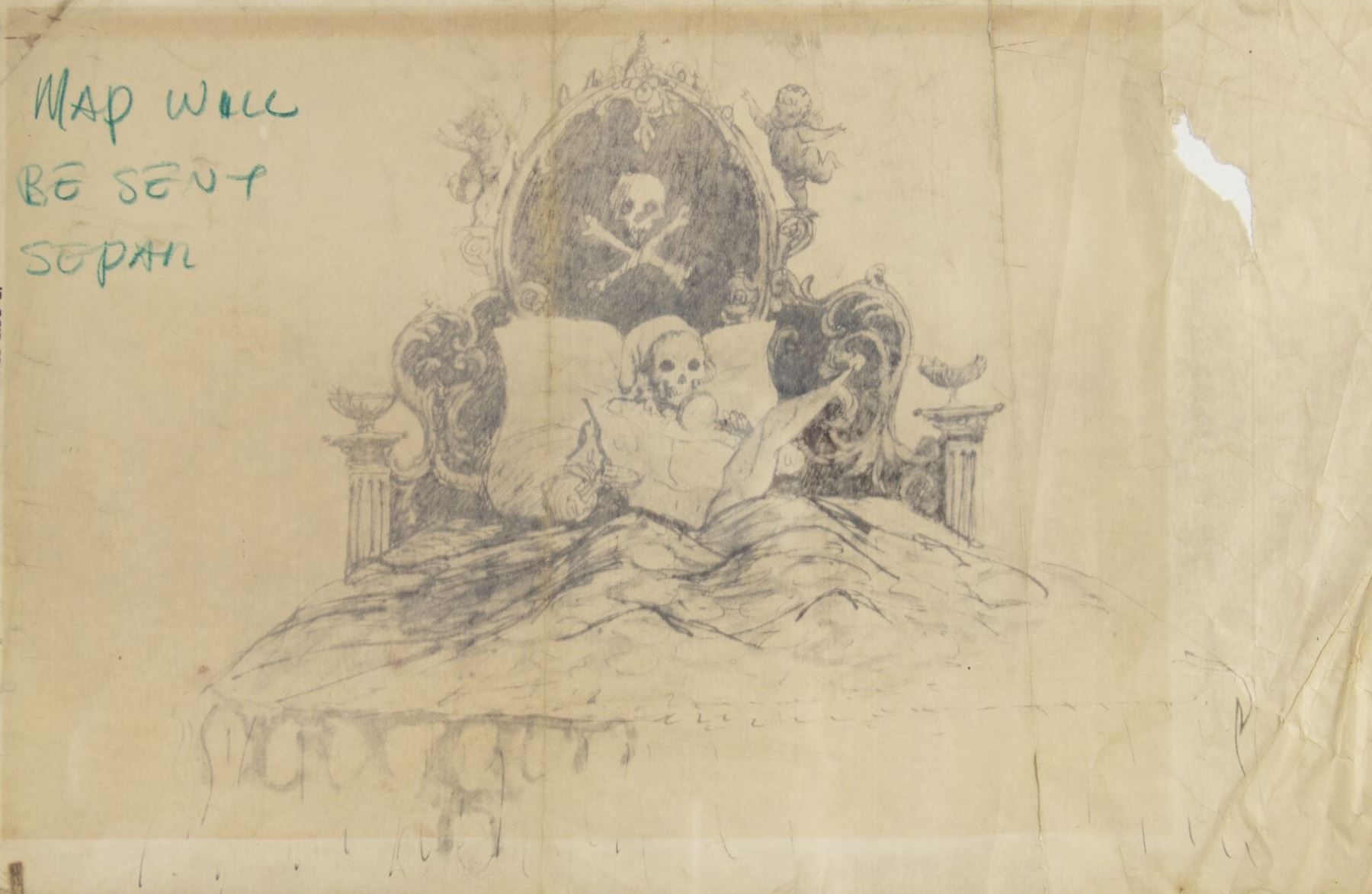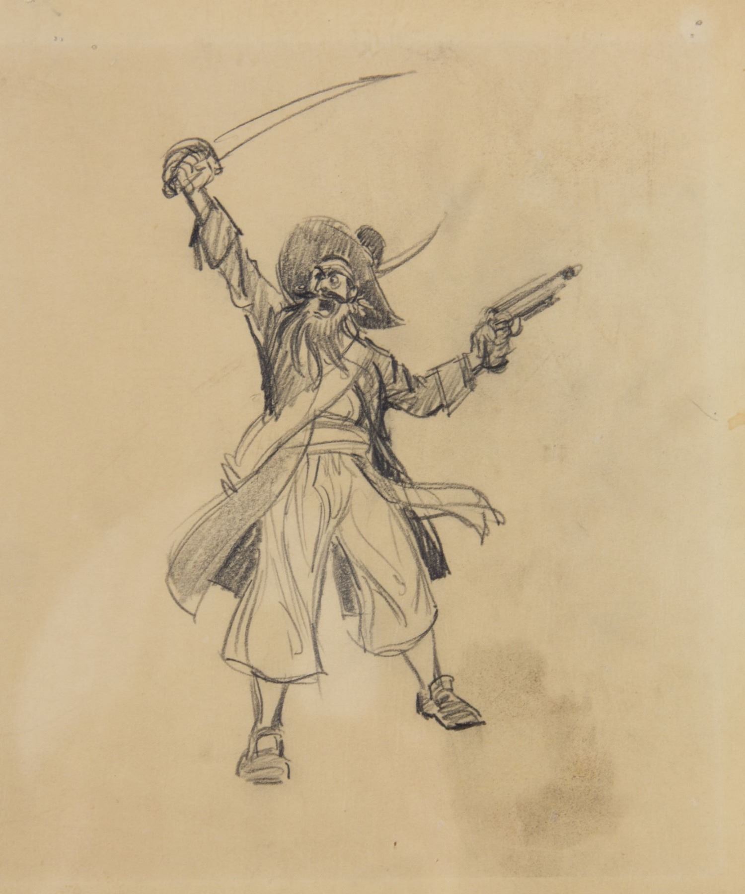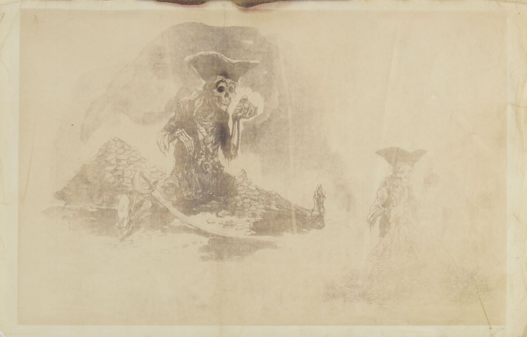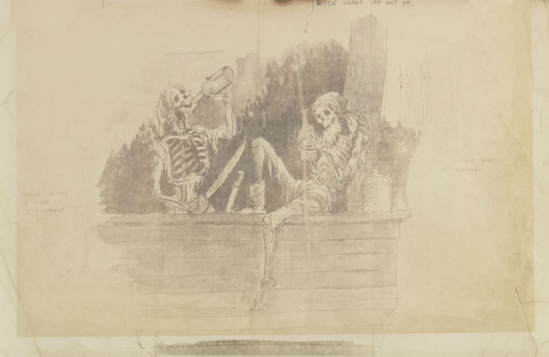 (Disneyland, c.1966) An extremely rare set of concept artwork used in the creation of the "Pirates of the Caribbean" attraction at Disneyland. The set includes (2) original drawings of pirates accomplished in graphite, and (3) brownlines of the skeletons seen throughout the attraction. One of the brownlines features writing in green pencil that reads, "map will be sent separ". The drawings measure approximately 6"x8" and 9"x8", and the brownlines measure 11"x17", each. Set is in overall good condition, with elements of wear throughout from their use in development. One brownline has a 2" tear in the top-right corner and wrinkling to the right-edge, and some of the sheets have minor tape residue on the back.