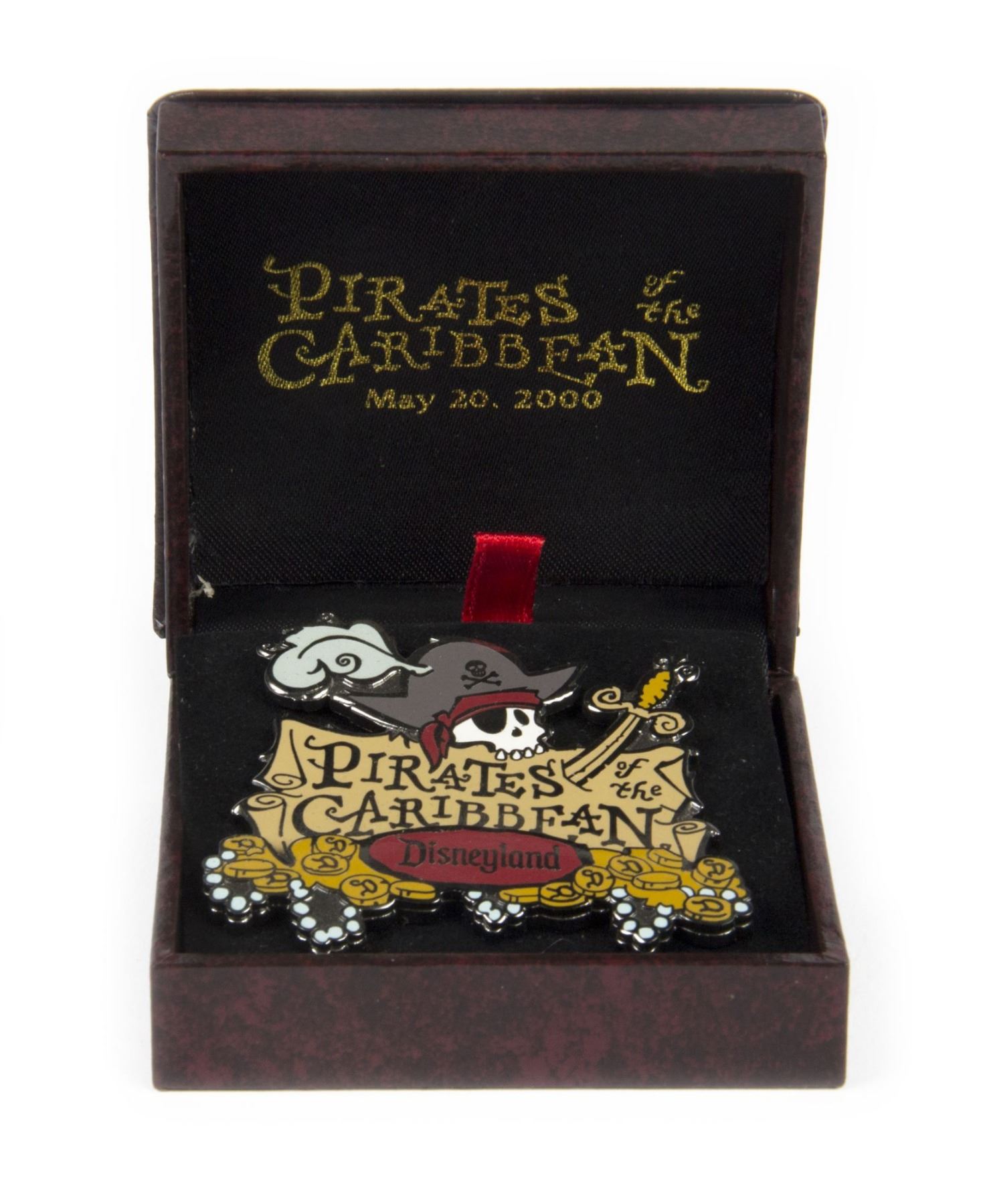 (Disneyland, 2000) A limited edition pin from a special "Pirates of the Caribbean" event at Disneyland on May 20, 2000. The event included a special panel discussion, a ride through the attraction, and special Pirates merchandise which was unique to the event. This pin was created in an edition of 1967 pieces, referring to the attraction's opening year, and comes in a treasure chest box that has the event logo under the lid. Measuring 2"x2.25", the pin is in very good condition with little wear.