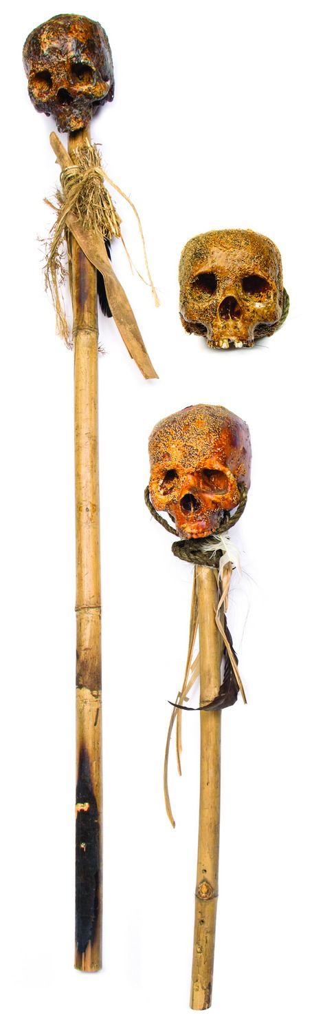 (Disneyland, 2006) A set of three prop skulls used at Disneyland during the park's premiere of "Pirates of the Caribbean: Dead Man's Chest". Two of the skulls are displayed over poles, and the skulls measure approximately 5.5" tall. The pole-mounts range in height from 28.5" to 48". The condition of this set is fair to good, with some chipping to the paint on the skulls and some spots of wear from use.