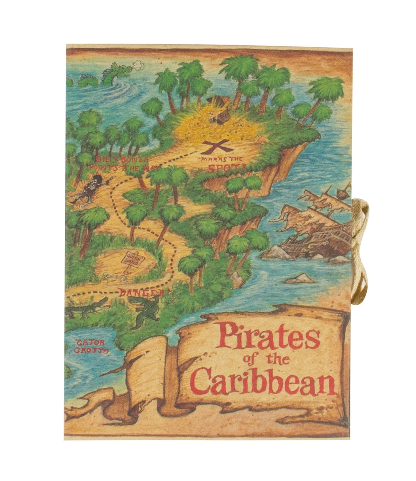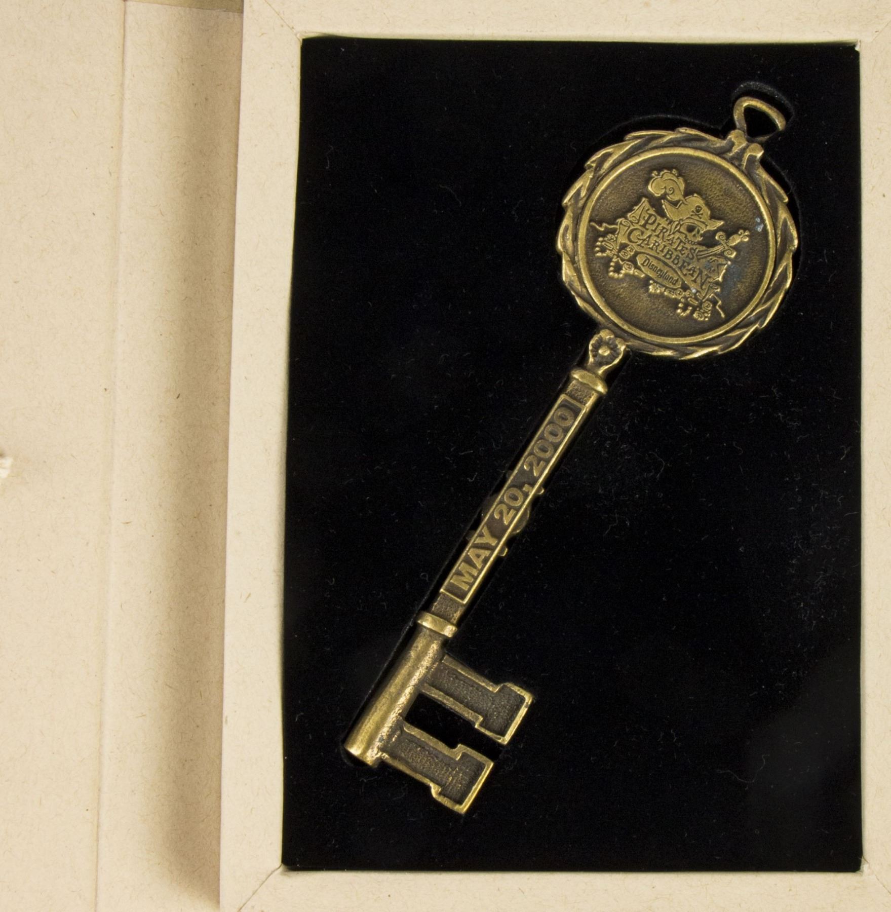 (Disneyland, 2000) A limited edition boxed metal key from a special "Pirates of the Caribbean" event at Disneyland on May 20, 2000. The event included a special panel discussion, a ride through the attraction, and special Pirates merchandise which was unique to the event. The key was custom made for the event and has a Pirates logo along the top and the date of the event in the body of the key. The key was created in an edition of 2500 pieces and comes in a treasure map box. The key measures 5.75" long and is in very good condition.