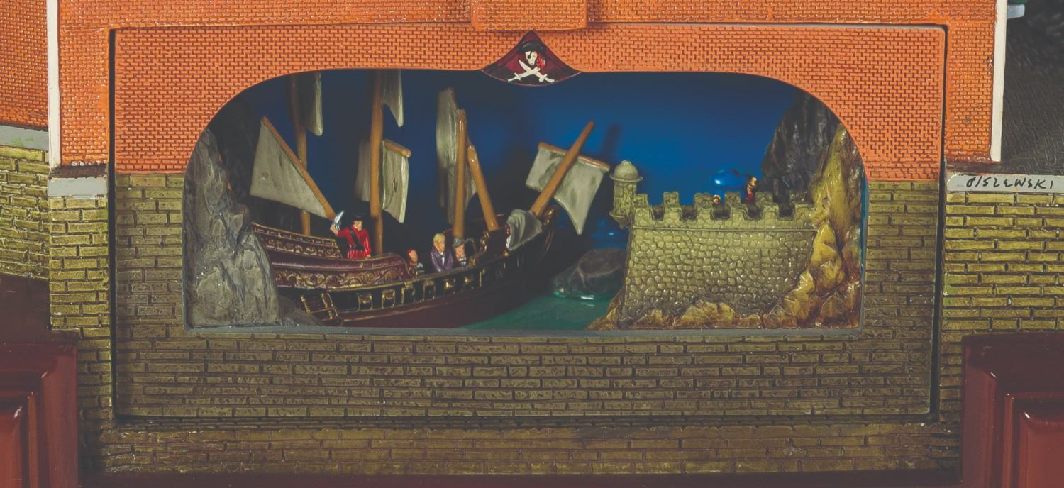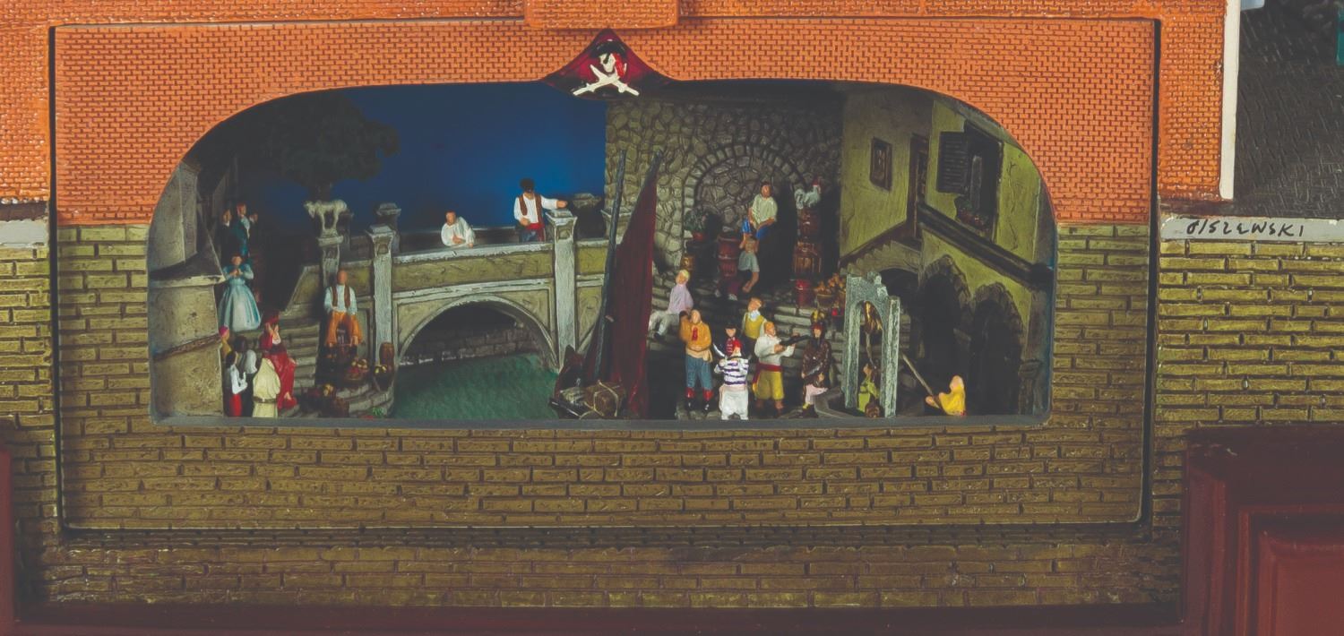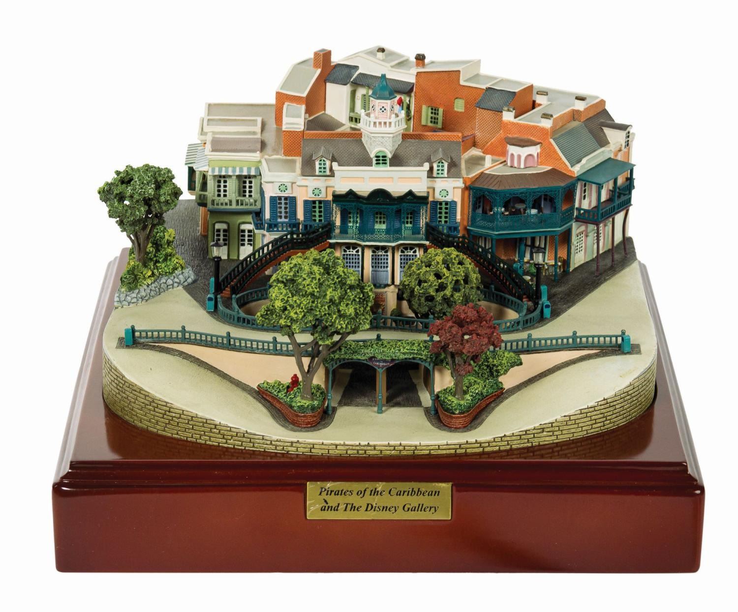 (Disneyland, 2006) An incredible first edition scale model of Disneyland's Pirates of the Caribbean attraction building created by Robert Olszewski. This very rare replica includes two scenes from the attraction which can be inserted into the back of the model and light up. The interchangeable scenes include the auction scene and a cannon fire scene. Measuring 10"x9.5" and 6" tall, the model is in very good condition with minimal wear and comes in its original box with its original COA, special premiere edition plaque, and power cord. The box shows some surface and edge-wear.