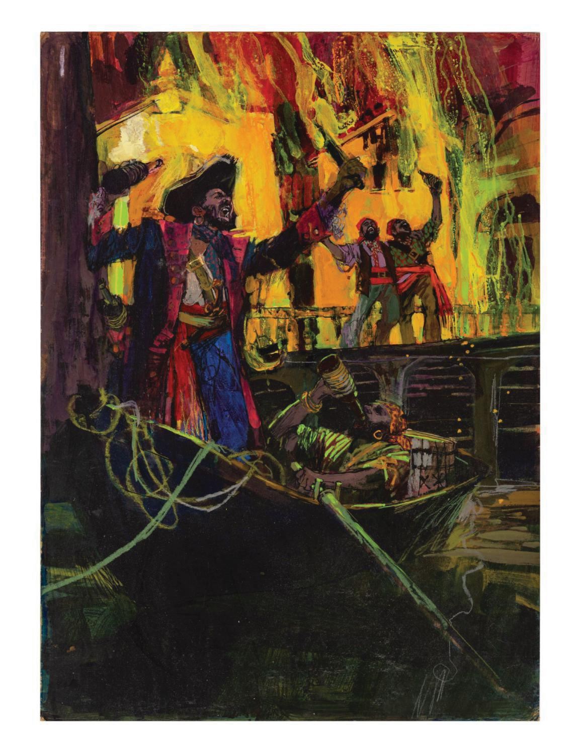 (Disneyland, c.1960s-70s) An original painting by Dan Martinez, created to promote the Pirates of the Caribbean attraction. Martinez, who served as Art Director of Disney News Magazine, likely created this artwork to promote the new attractions at both Disneyland and Walt Disney World. It depicts a wild crew of brazen buccaneers drunk on the spoils of plunderin', following a fiery coastal raid of Puerto Dorado. The kinetic brushstrokes and highlights of bold reds and electric greens in this one-of-a-kind artwork wonderfully capture the frenetic energy and blazing heat of the intense scene. Measuring 26"x19", the painting is in very good condition with minor wear to the corners, edges, and reverse of the artists board, retaining some original artists' tape on reverse.