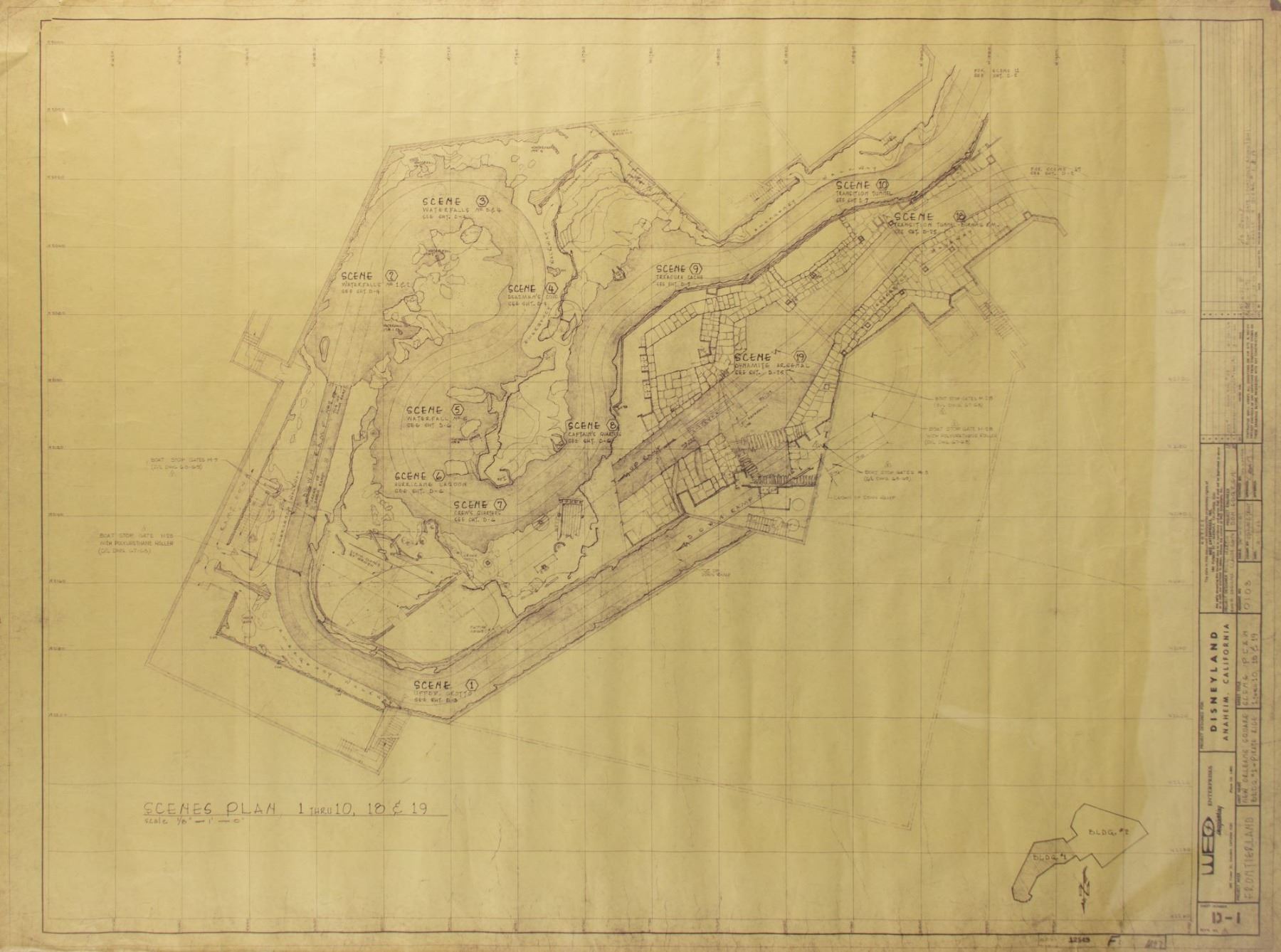 (Disneyland, 1971) A rare brownline for the layout of the "Pirates of the Caribbean" attraction at Disneyland. This "Scenes Plan" features details of the path the boats would take within the attraction as well as the locations of the different scenes. The depicted scenes include such memorable locations as the "Upper Grotto", "Captain's Quarters", and "Dead Man's Cove". Titled "Scene Plan 1 Thru 10, 18 & 19" with a revision date of 6-21-71, this brownline measures approximately 36"x48". The condition is very good with minor wear and creasing throughout. There is some fraying and a few minor tears in the corners.