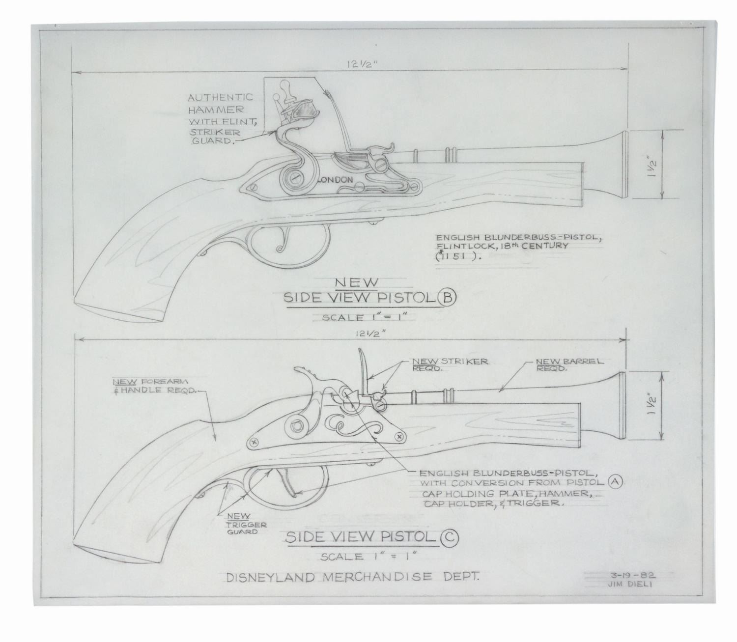 (Disneyland, 1982) An original concept drawing for a souvenir pistol to be sold at Disneyland in the 1980s. Created by Disneyland's Merchandise Department, the drawing depicts technical aspects of the previous and newly designed versions of the souvenir pistol. It is based on similar pistols used in the Pirates of the Caribbean attraction. Accomplished in pencil on vellum, the drawing measures 13"x15.5" and is in very fine condition.