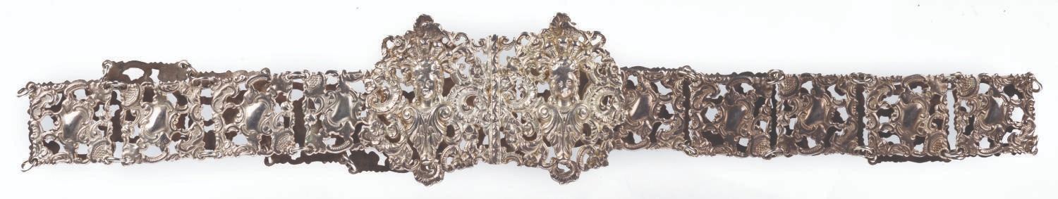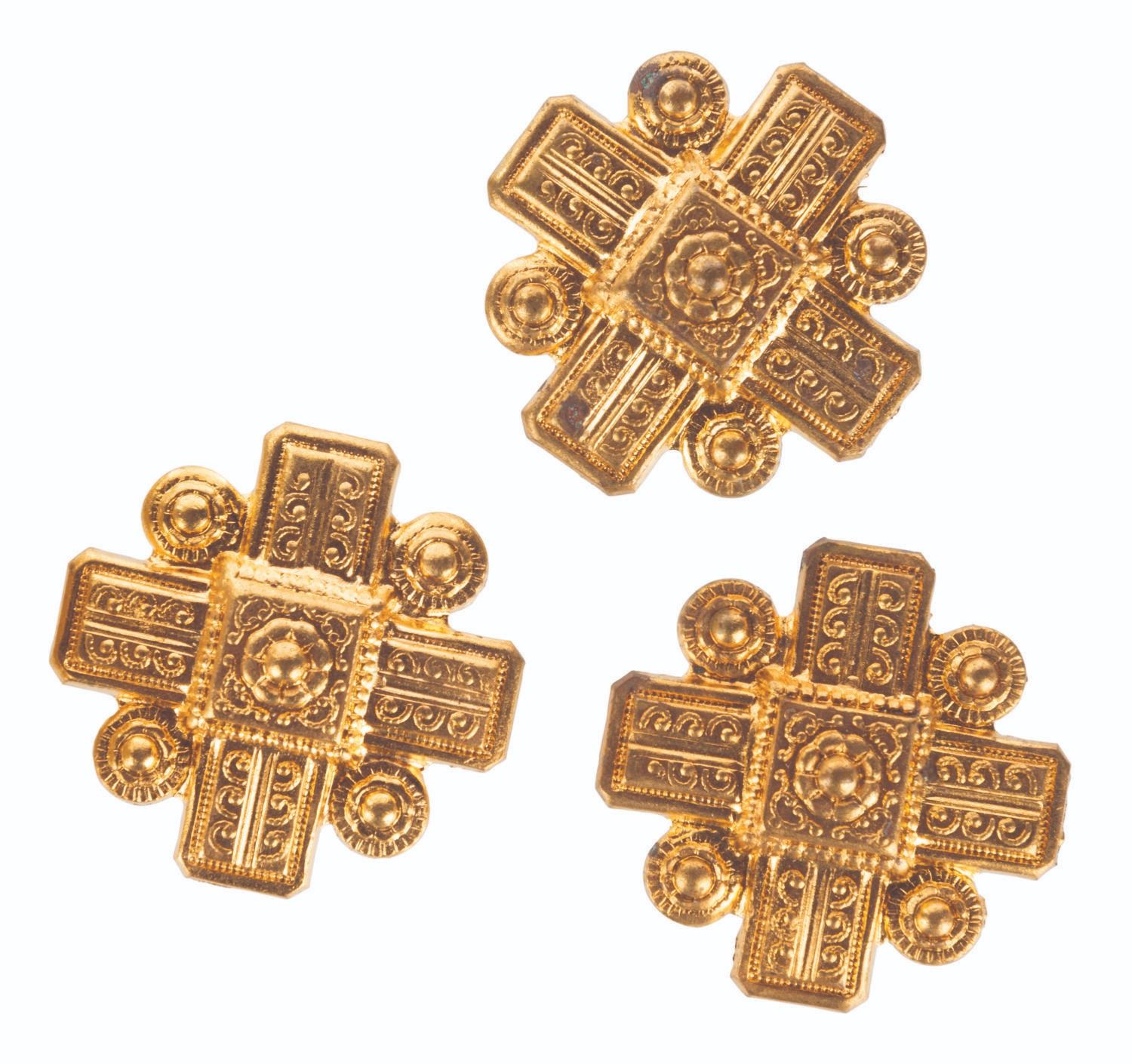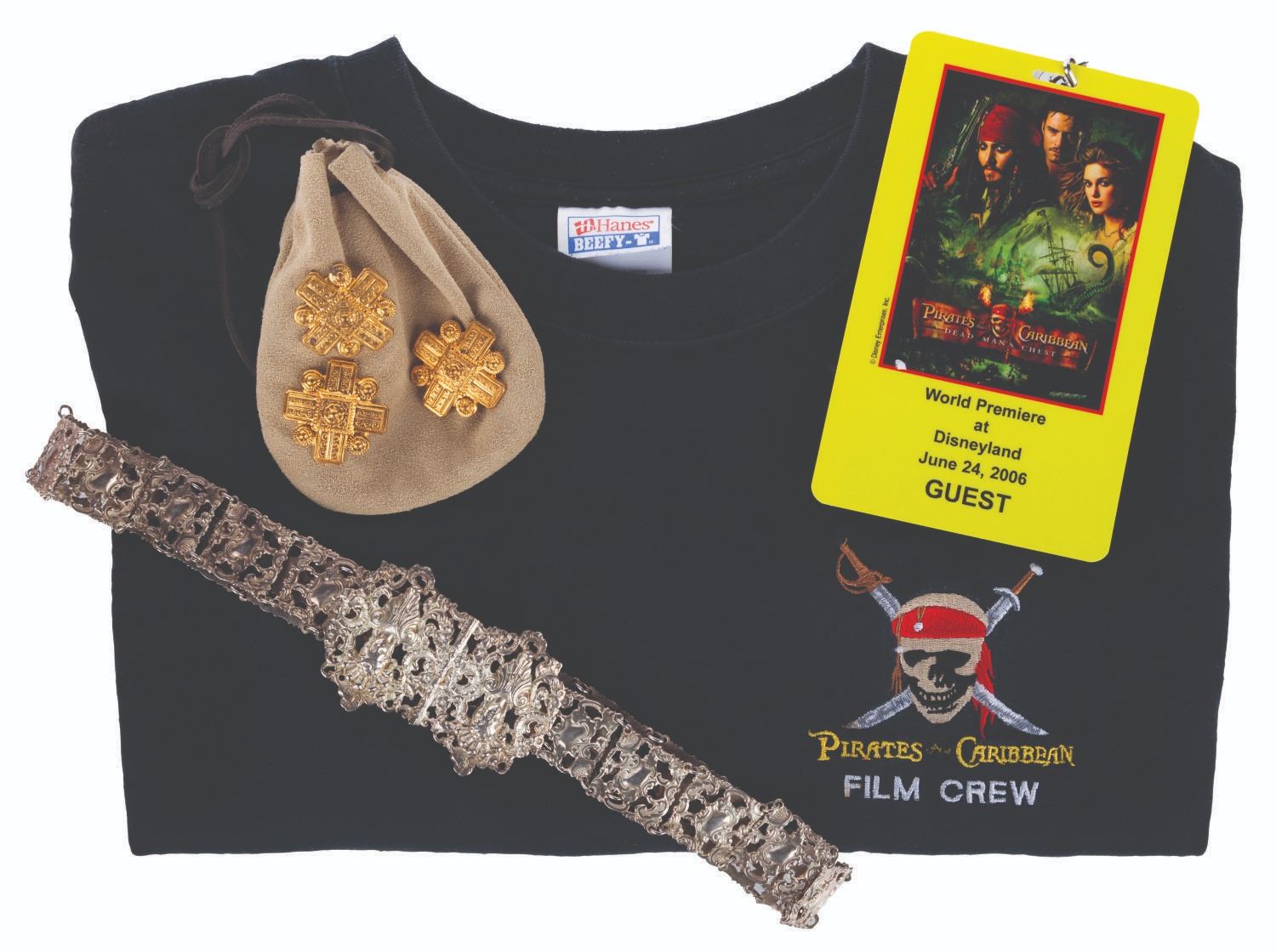 (Disney, 2003/2006) A collection of Isla de Muerta treasure props from "The Curse of the Black Pearl,” a "Dead Man’s Chest” premiere guest pass, and a crew gift shirt from the franchise. The Isla de Muerta treasure includes a pewter belt and three Aztec brass ornaments in a suede pouch. The pass is for the World Premiere of the second film at Disneyland on June 24, 2006. Measuring from the 1.25” x 1.25” Aztec ornaments to the 2.75” x 27.75” belt, the props are in very good condition with light wear from production use. The shirt labeled a size "Adult L” and the premiere pass are both in fine condition.