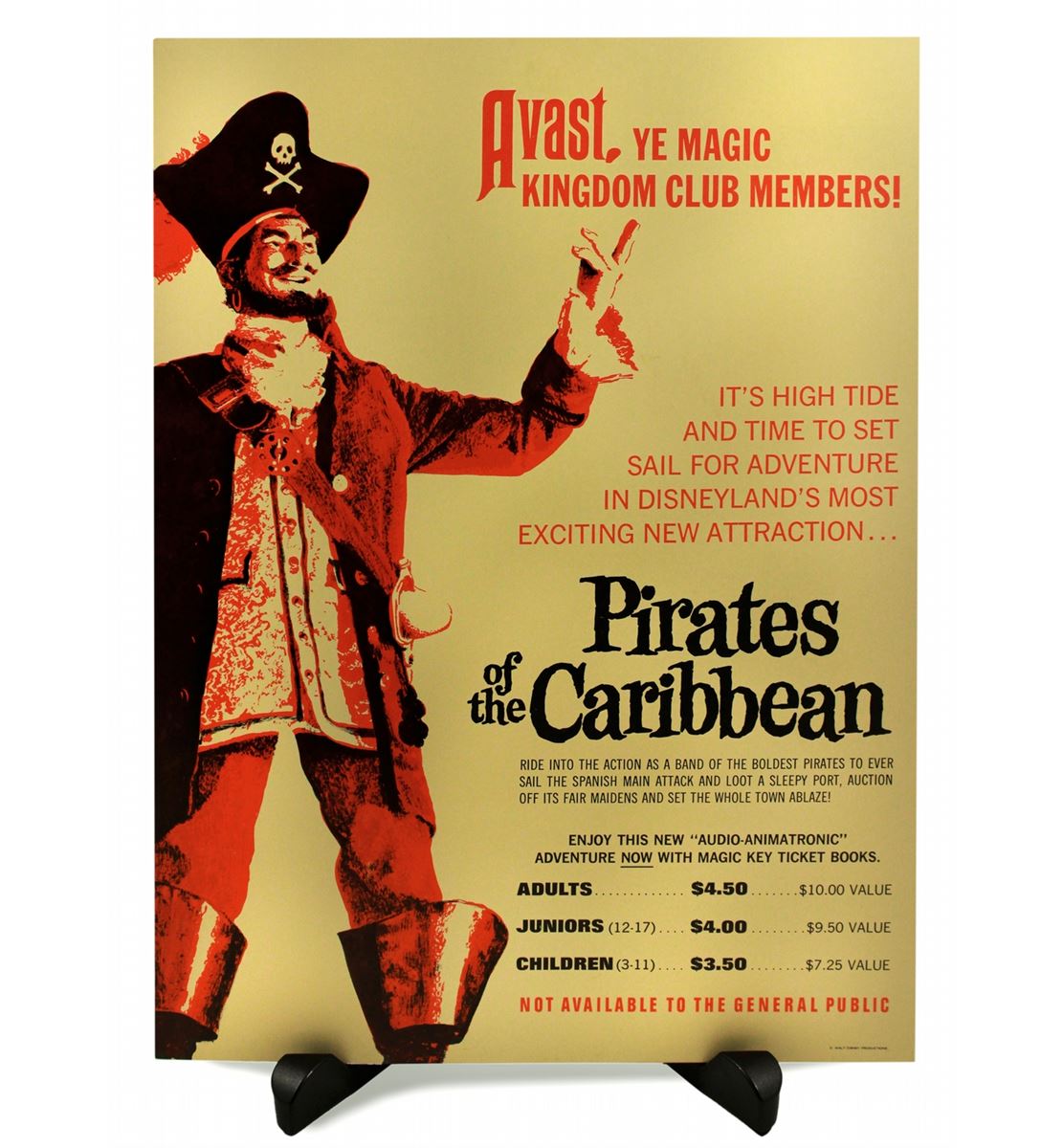 (Disneyland, 1967) Rare 12 x 9 in. Main Gate Ticket Booth poster for the opening of the Pirates of the Caribbean attraction in 1967. These rare point-of-sale posters were printed at the Disneyland Print Shop for exclusive distribution at the Disneyland ticket booths to promote the membership of the Magic Kingdom Club,…the equivalent of today’s Annual Pass membership. Special pricing and events would occasionally be made available to club members and at one time, the local Southern California membership was massive. A striking poster in very good condition.