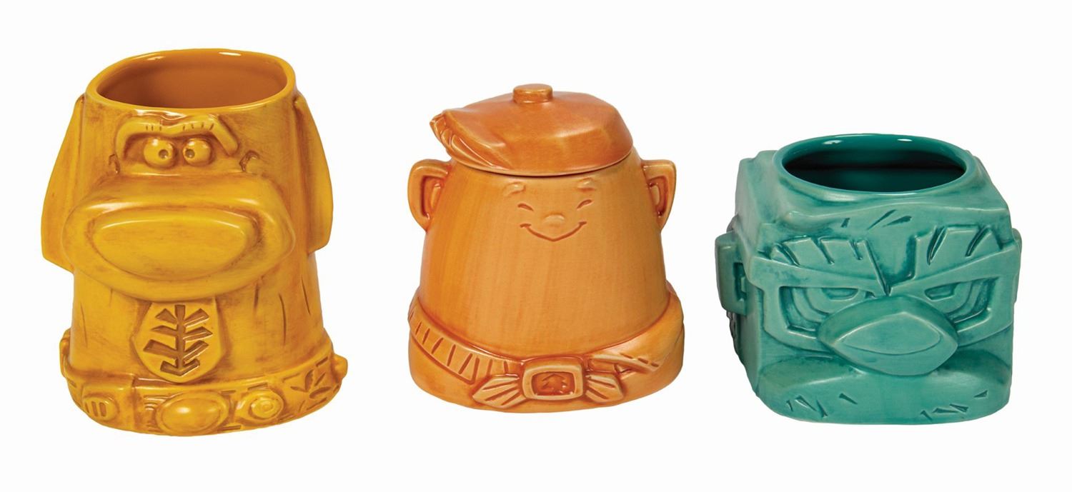 (Disneyland Paris, 2019) A limited edition set of (3) stackable ceramic tiki mugs based on characters from Pixar's Up. Created by Kevin Kidney and Jody Daily for the 10th anniversary of the film, these mugs depict Russell, Carl, and Dug and stack in a totem style with a lid for the Russell mug. Limited to only 1000 pieces, these hard to find mugs measure 13.5" tall when stacked and are in very fine condition in their original box.