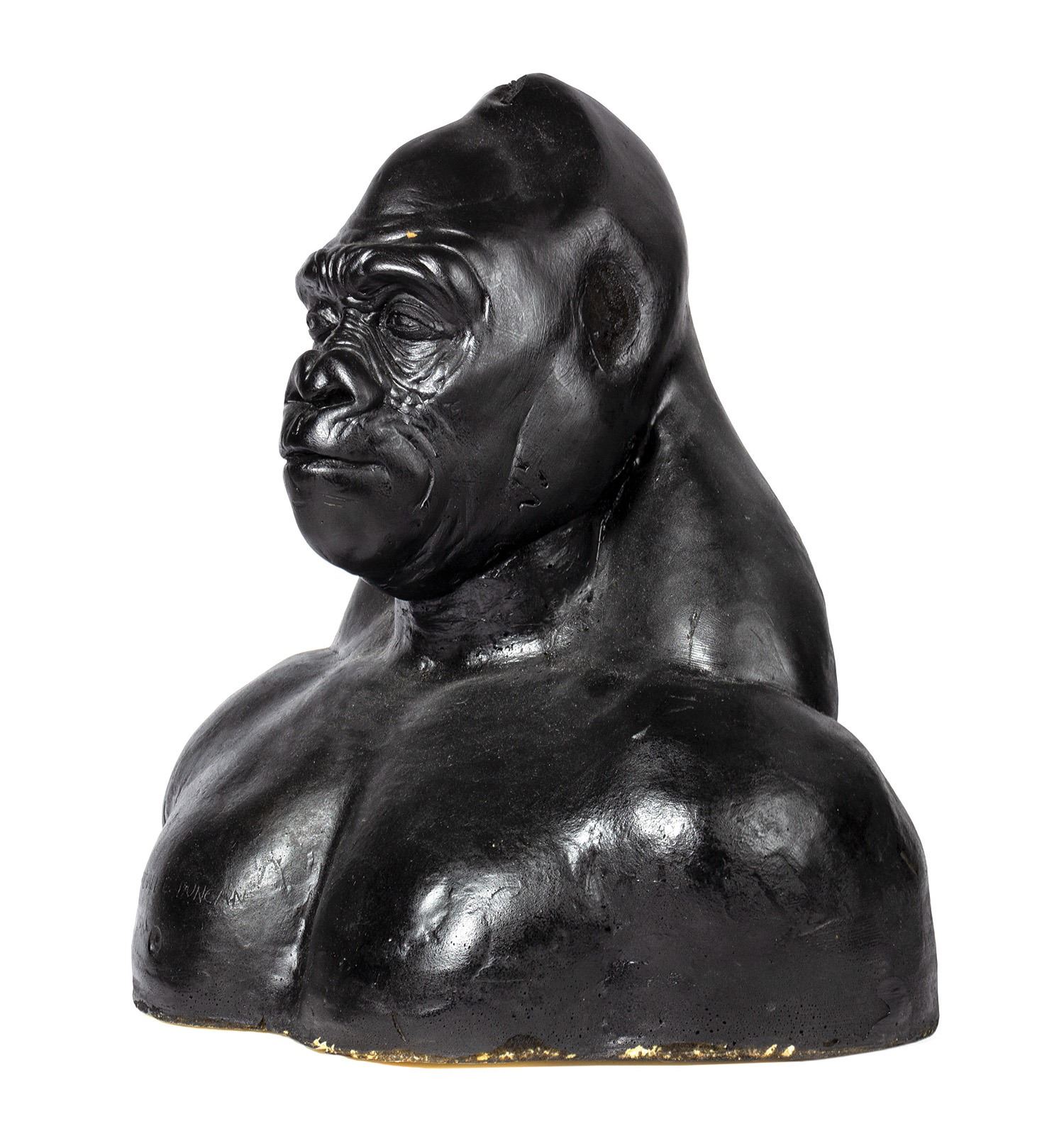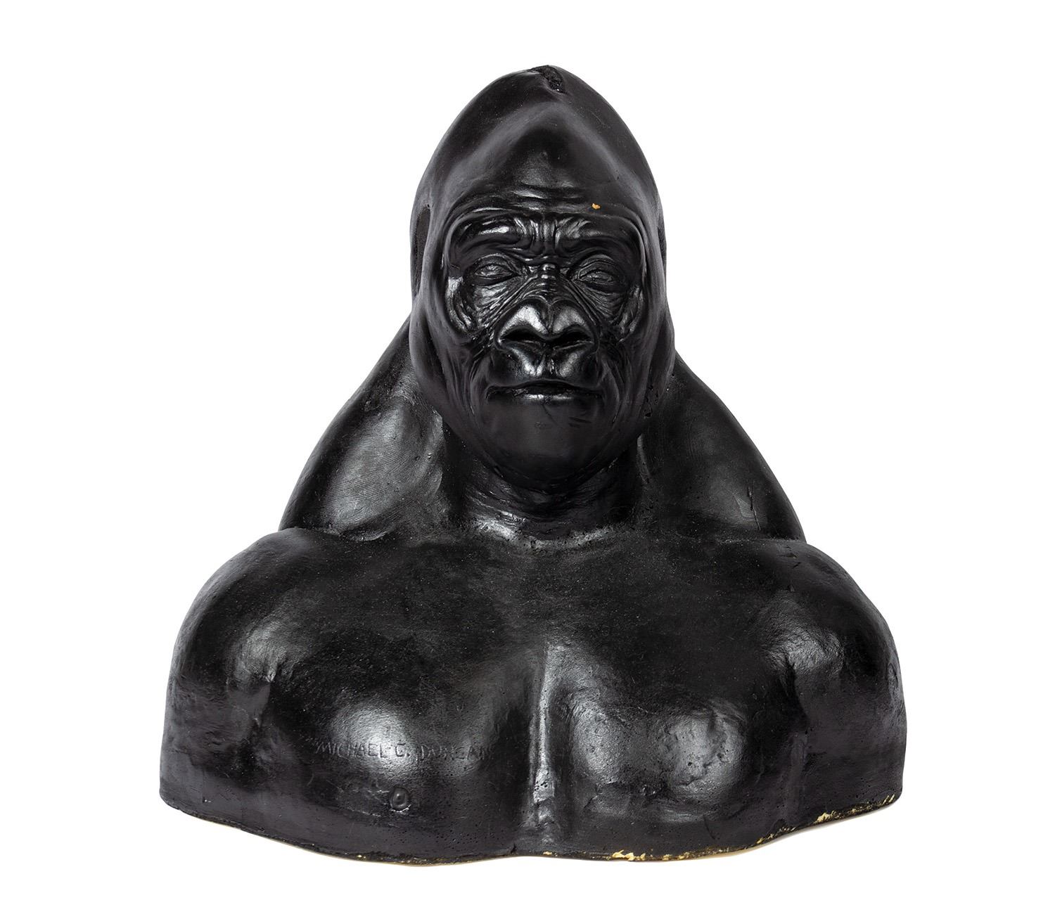 (20th Century Fox, 2001) A study bust of the character Attar from Tim Burton's Planet of the Apes. This bust was likely used to help with the creation of the prosthetics and makeup for the character, and is marked on the pectoral with the name "Michael C. Duncan," who portrayed Attar in the film. Molded in a dense foam, the bust is approximately 22.5" tall and is in very good condition, with some wear throughout from use. Although there are several divots and cracks in the foam, it appears that these markings are from production.