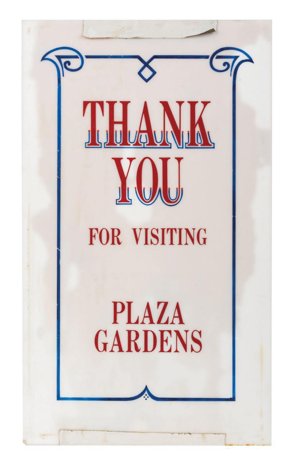(Disneyland, c.1997-2012) A “Thank You for Visiting" Park-used sign from the Plaza Gardens. The sign was produced during the post-Carnation sponsorship, when the attraction was under the oversight of the Disneyland Foods Division, and was displayed near the exit of the outdoor dining and entertainment location at Disneyland. When Carnation's sponsorship of the location ended, the word "Carnation" was removed from above the words "Plaza Gardens." Faint scratches in the shape of the word "Carnation" can still be seen on the sign under the correct lighting. Measuring approximately 11.25”x19”, the hand-painted acrylic sign with trimmed and applied lettering is in good Park-used condition, with spots of discoloration, scuffs, and wear throughout from use.