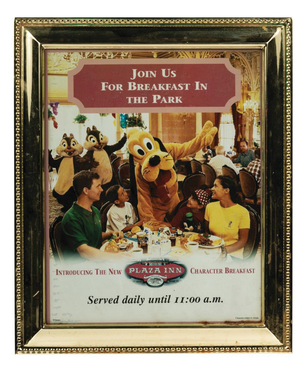 (Disneyland, c.1980s) An advertisement introducing the new Plaza Inn Character Breakfast. This interactive breakfast was hosted by Columbian Coffee Growers, occurring daily until 11:00 a.m. The original printed photograph measures 7.5"x9", and is in fine condition, displayed inside a 11"x9" gold toned frame, that is believed to be its original table-top frame, as-used at the Park.
