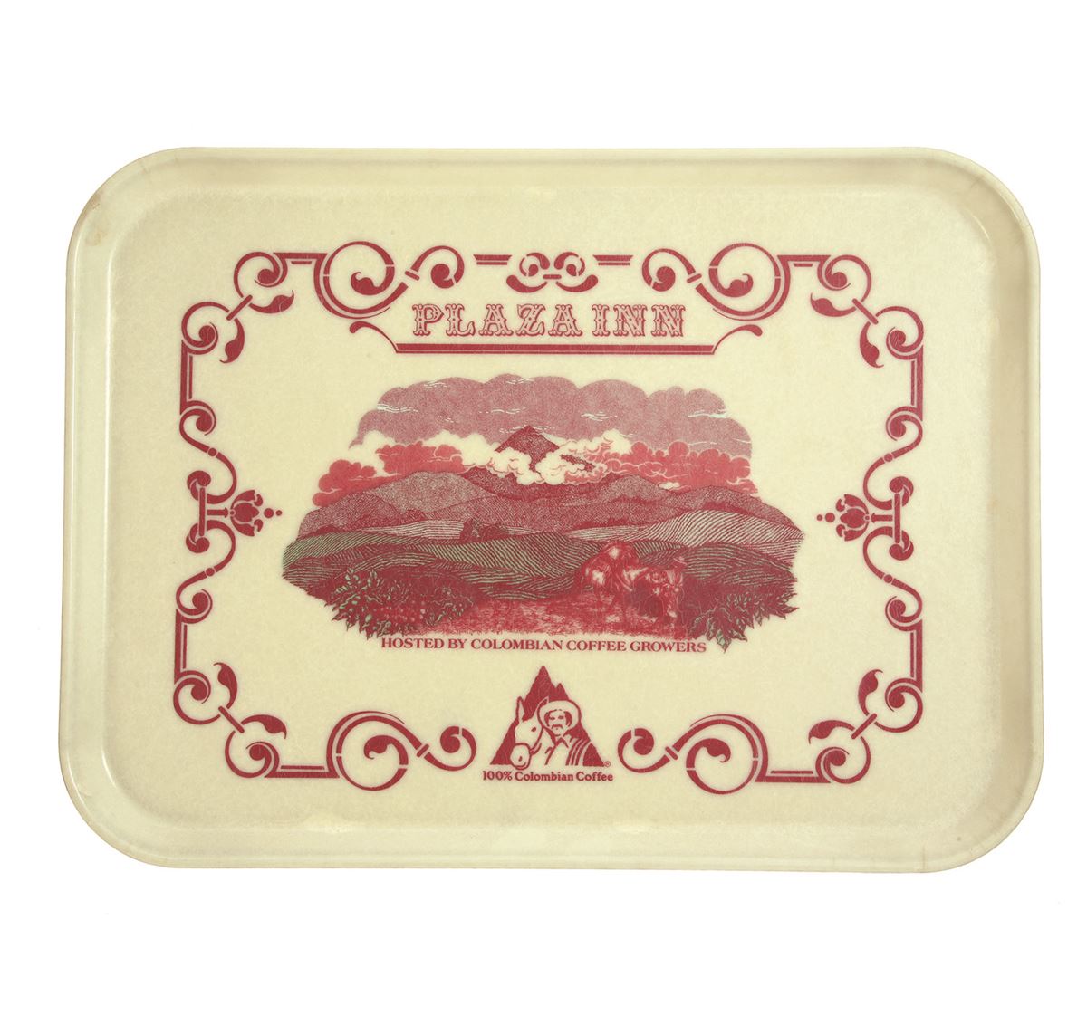 (Disneyland, 1990) This green slightly larger-version of the Disneyland food service tray features the text "Plaza Inn Hosted By Colombian Coffee Growers" surrounded by a maroon boarder. This tray was used at the Plaza Inn in Disneyland and advertised for "100% Colombian Coffee". Measures 15"x20.5"x1". In good condition, with minimal wear, discoloration, and scuffing from its use at the park.