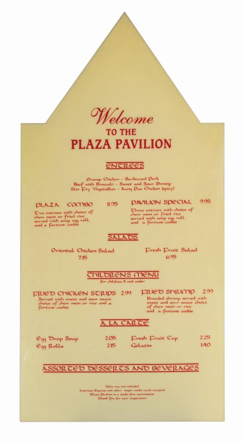 (Disneyland, c.1990s) A large menu sign for the Plaza Pavilion at Disneyland. An opening day restaurant, the Plaza Pavilion operated for 42 years before shutting down in 1997. The space was used for various guest services until 2012, when it was reopened as the Jolly Holiday Bakery. This unique menu deviates from the restaurant's familiar Italian fare and offers Chinese food instead and was likely created for an event or a short-lived menu change. Measuring 42"x21", the sign is in very good condition with some scratching and scuffing to the surface, including a few spots of paint loss to the text.