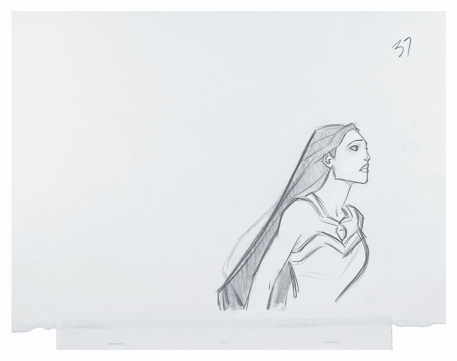 (Disney, 1995) An original production drawing of Pocahontas from the similarly titled animated feature. The drawing is accomplished in graphite on 13"x17" animation paper. The drawing was "re-pegged" during production, a common practice to realign an image to a background. The bottom of the drawing has had the peg holes torn away and a new strip of peg holes applied. Overall the drawing is in very good condition with minor wear.