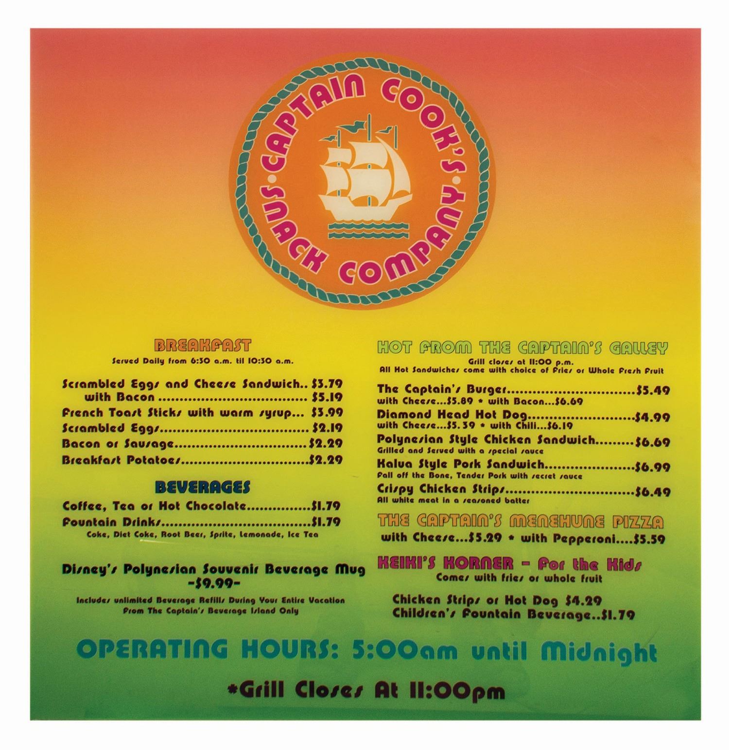 (Polynesian Resort, c.1990s) A vibrant menu sign for Captain Cook's Snack Company at the Polynesian Resort. The colorful all-day menu is printed on acrylic, with a protective layer on the back to prevent scratching to the imagery. Measuring 28.5"x26.5", the sign is in very good used condition, with scuffing and scratching to the surface as expected from display. The protective layer on the reverse is peeling slightly at the lower right corner.