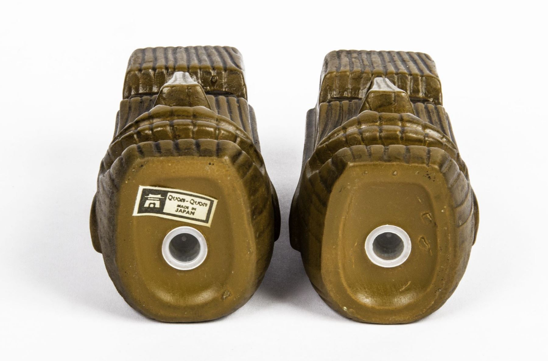 (Disneyland, 1960s) A pair of ceramic salt and pepper shakers from Adventureland featuring matching Polynesian imagery. One shaker has its original manufacturing label on the base from Quon-Quon of Japan. The shakers measure 4.25" tall and are in very good condition.